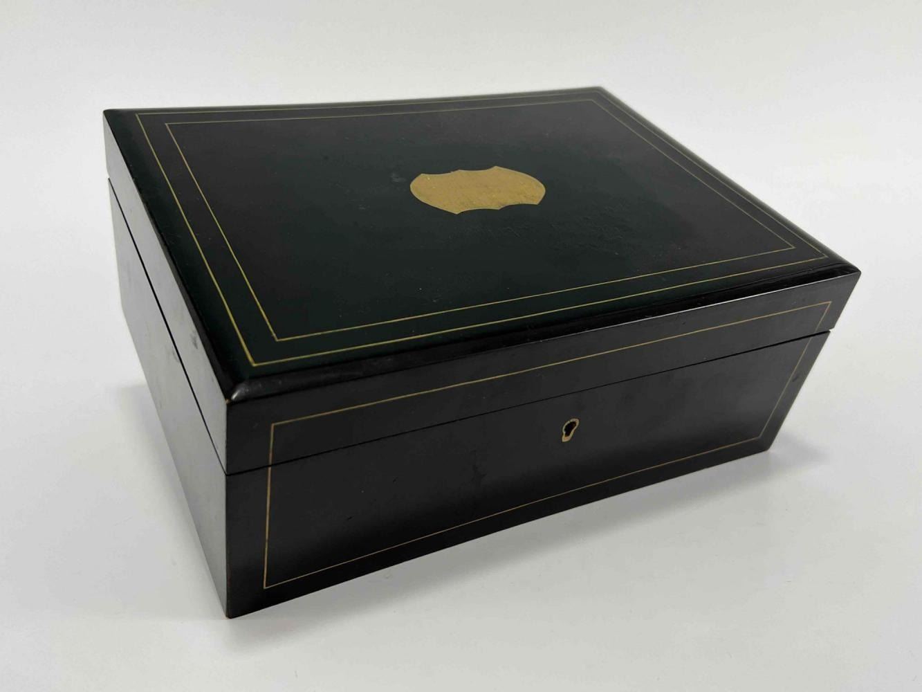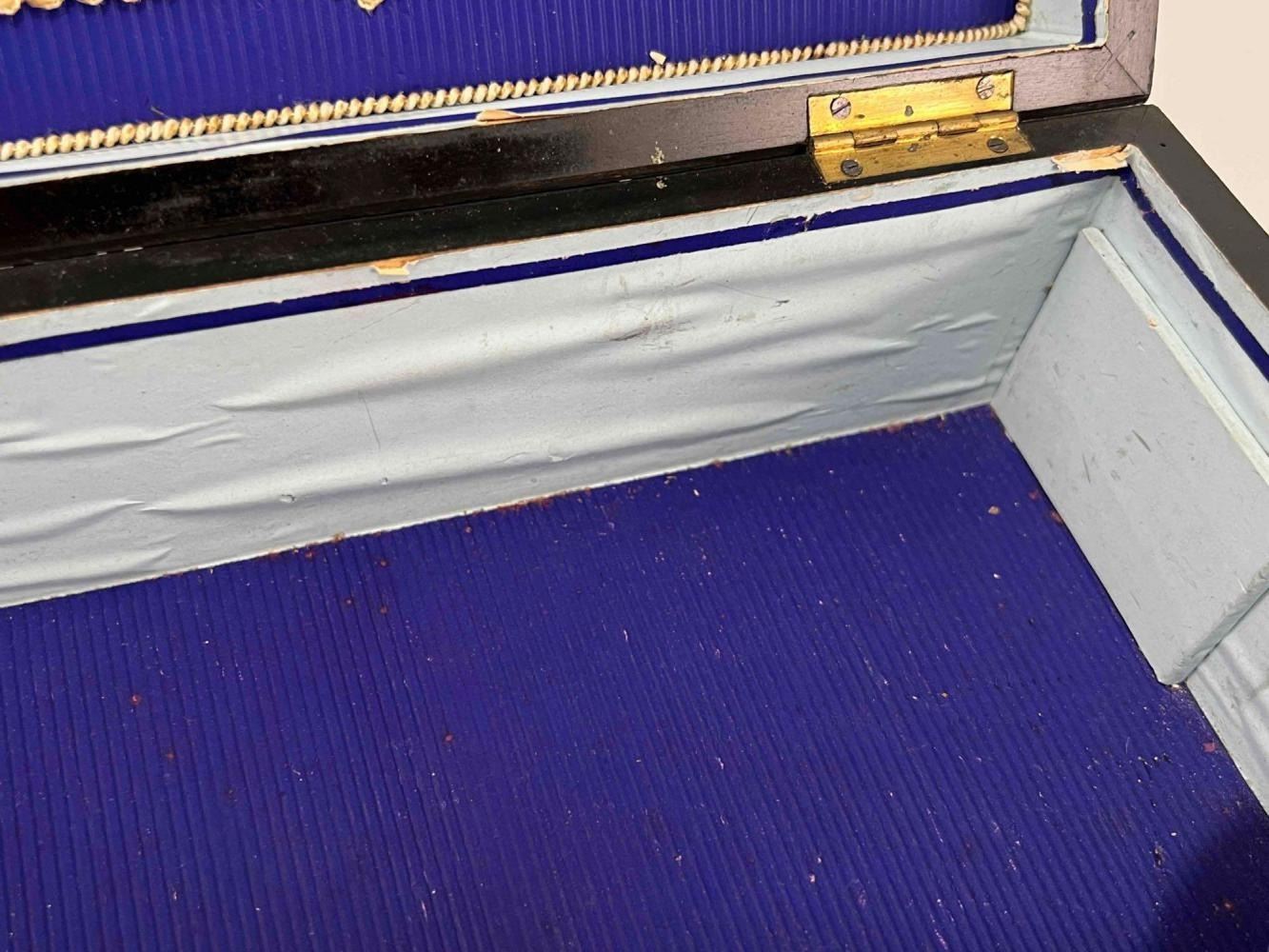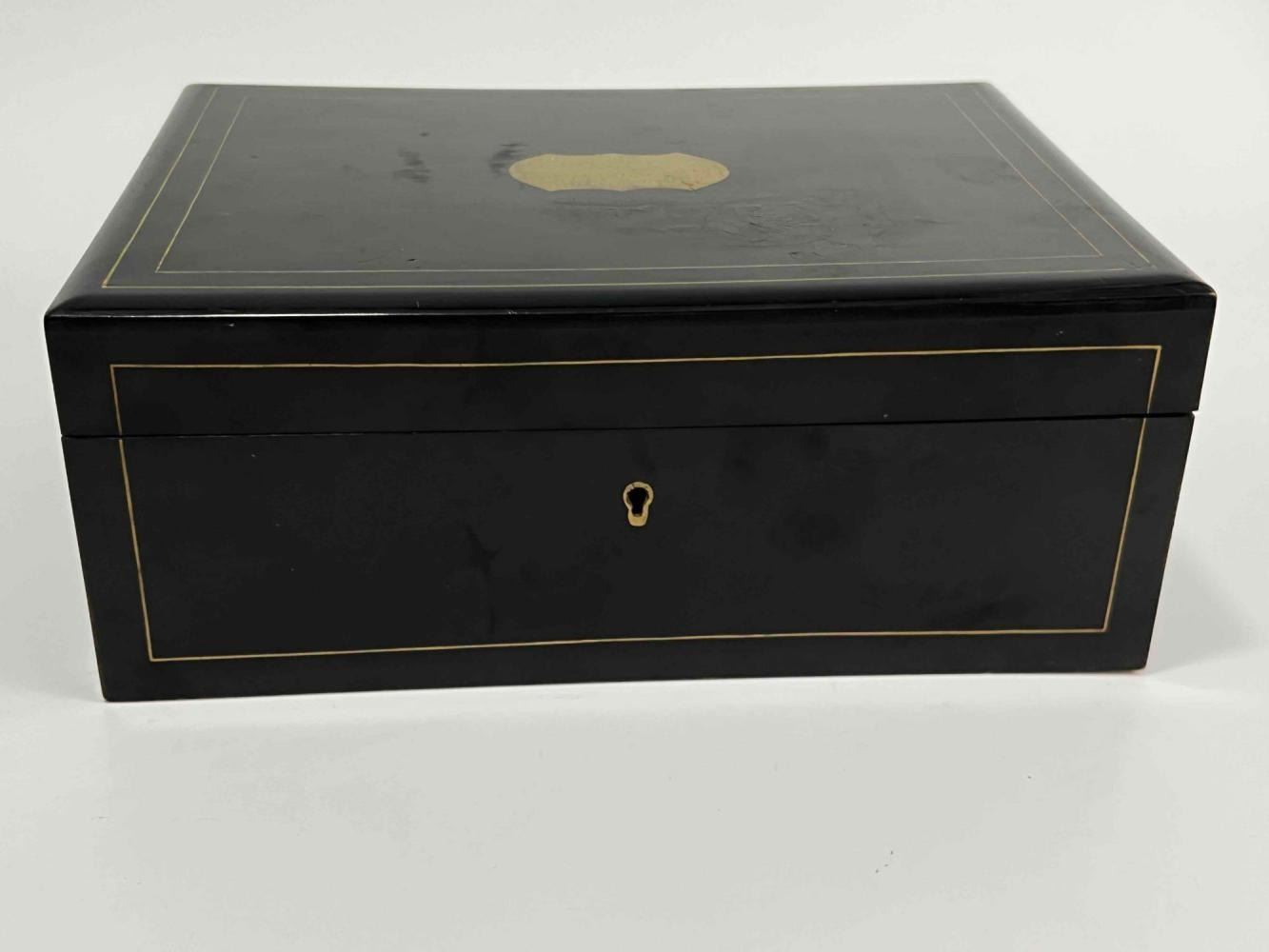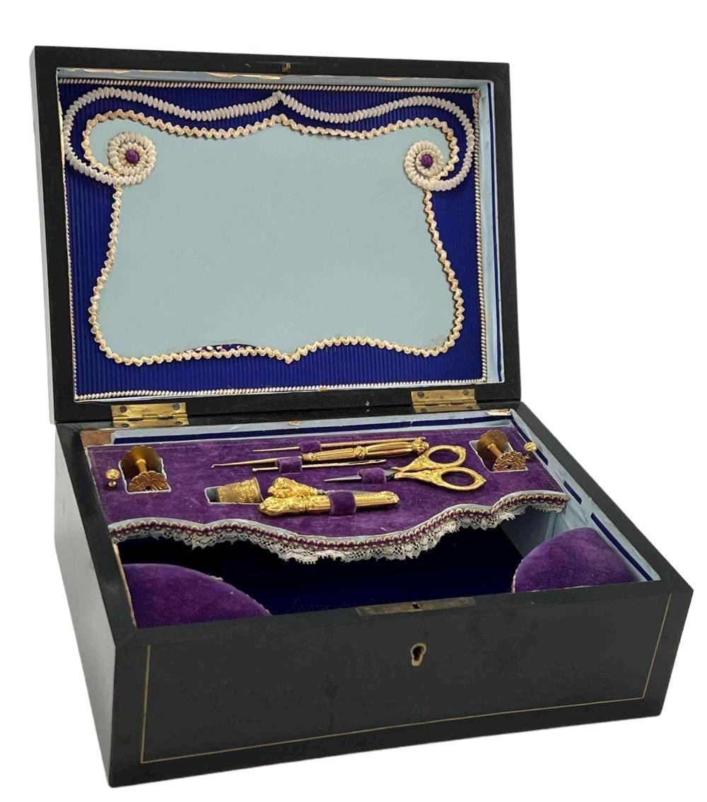 Antique Victorian Sewing Box With 9 Highly Decorative Pieces Of Sewing Equipment Including Scissors, Needle Box, Needle Threaders, And Bobbins. Includes Key. Box Approximately 9.5 L x 7 W x 3.75 D Inches. Smallest Item Approximately 0.5 L x 025 W x 0.25 D Inches.