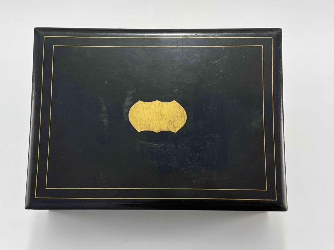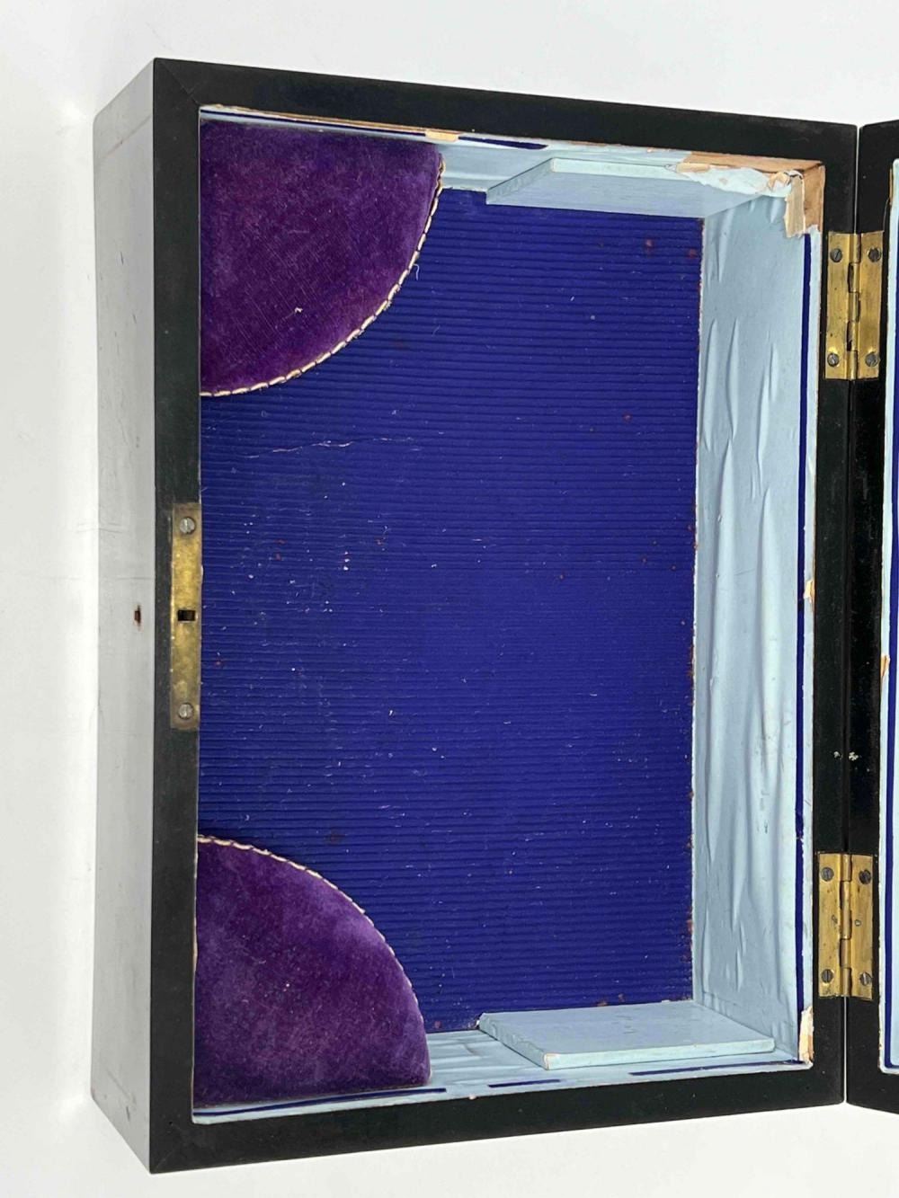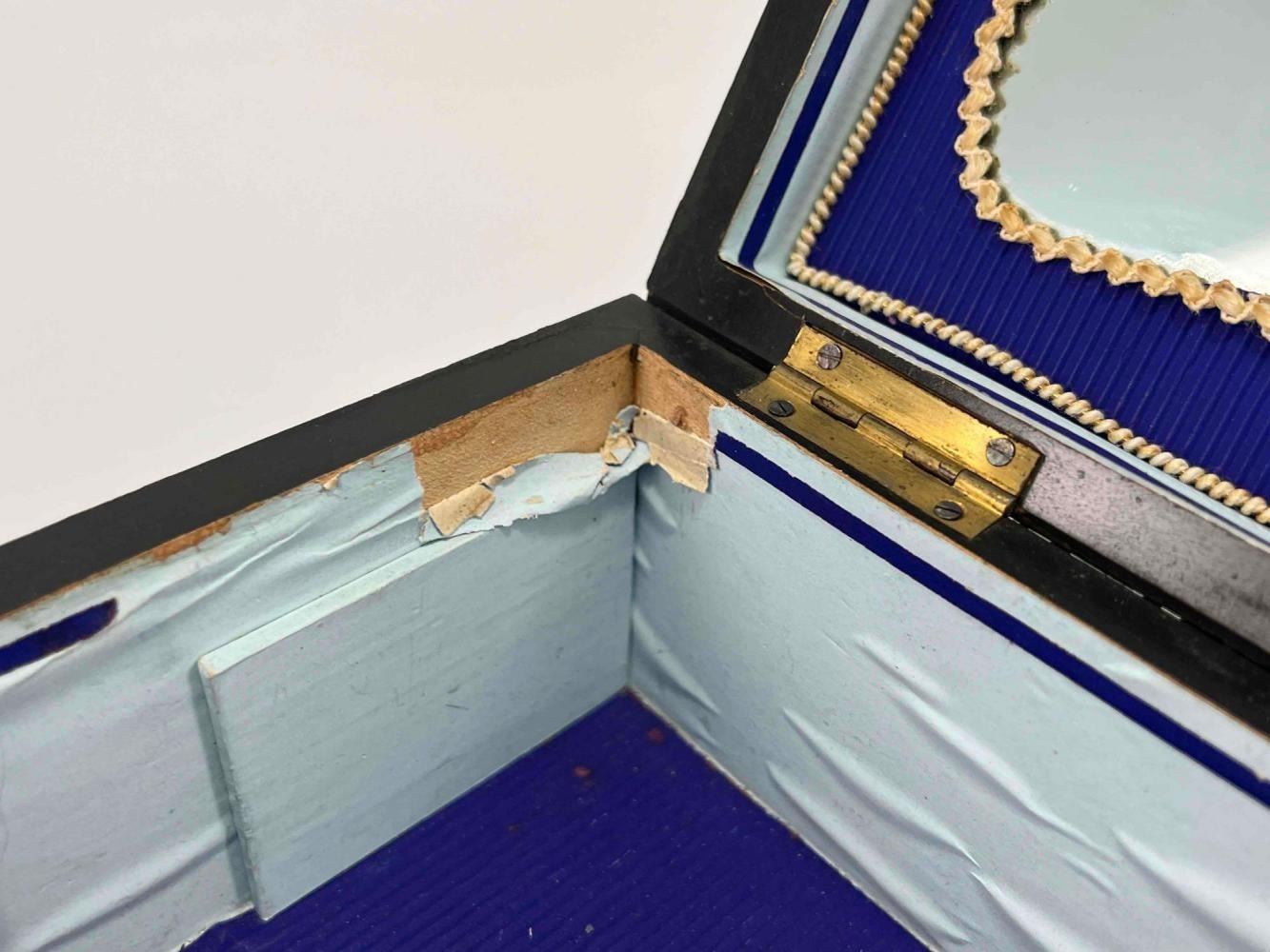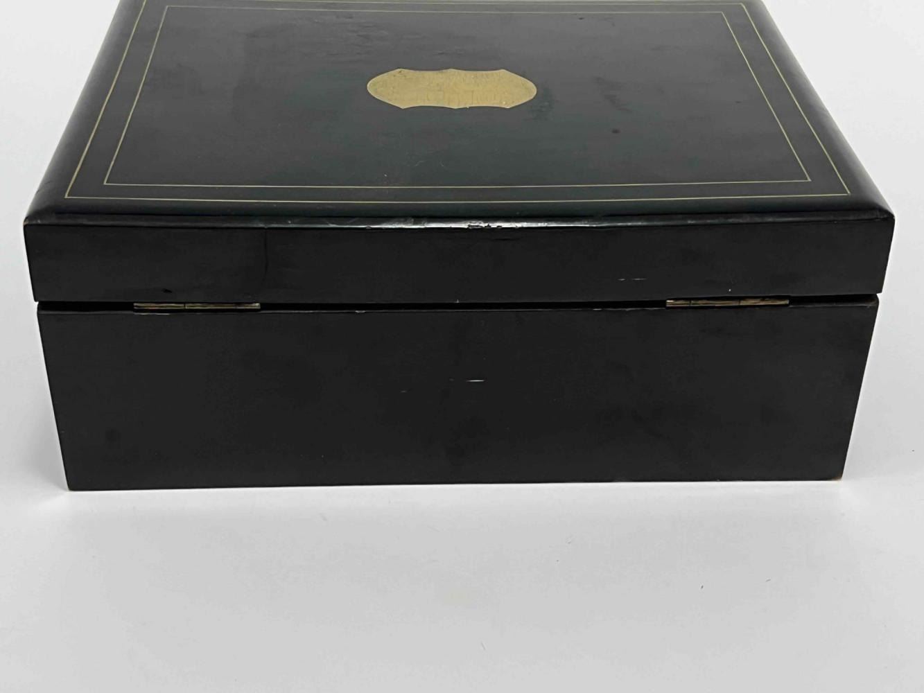 Antique Victorian Sewing Box With 9 Highly Decorative Pieces Of Sewing Equipment Including Scissors, Needle Box, Needle Threaders, And Bobbins. Includes Key. Box Approximately 9.5 L x 7 W x 3.75 D Inches. Smallest Item Approximately 0.5 L x 025 W x 0.25 D Inches.