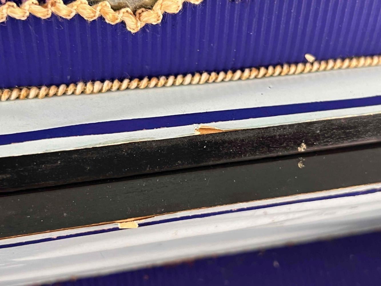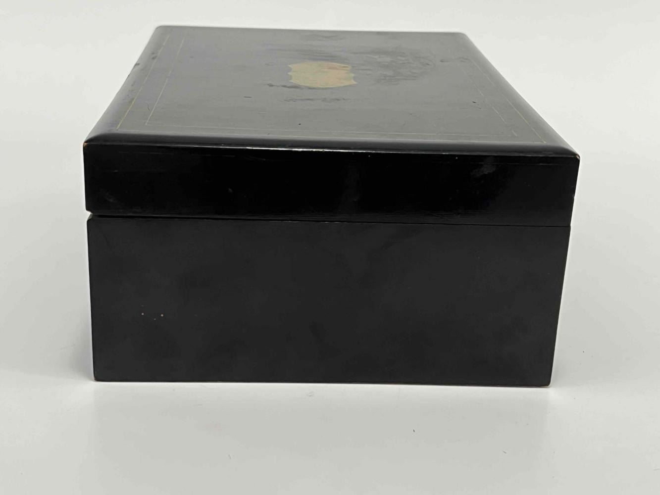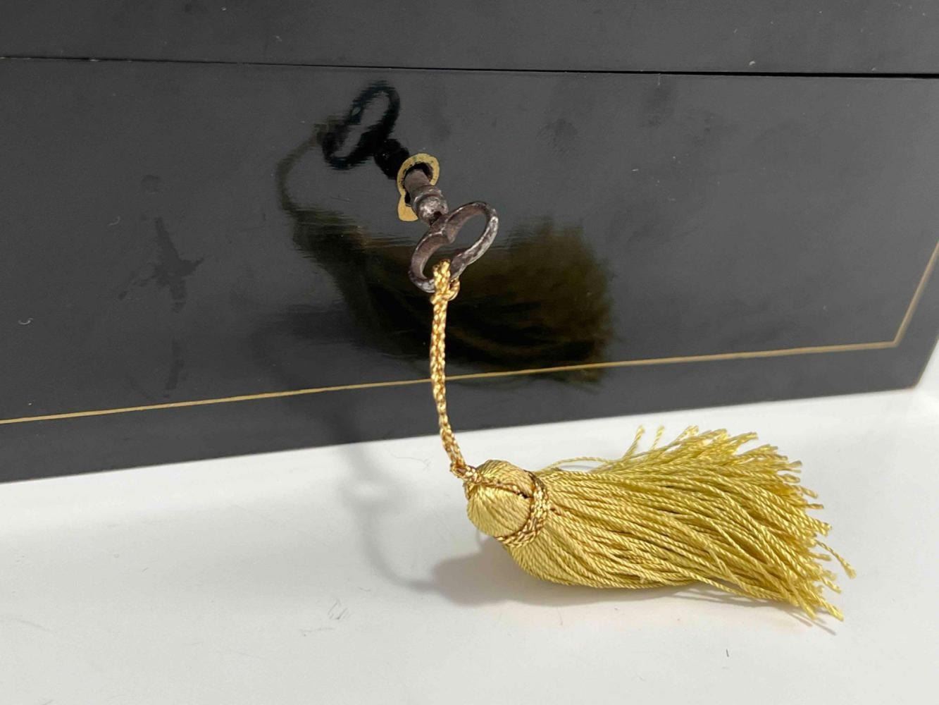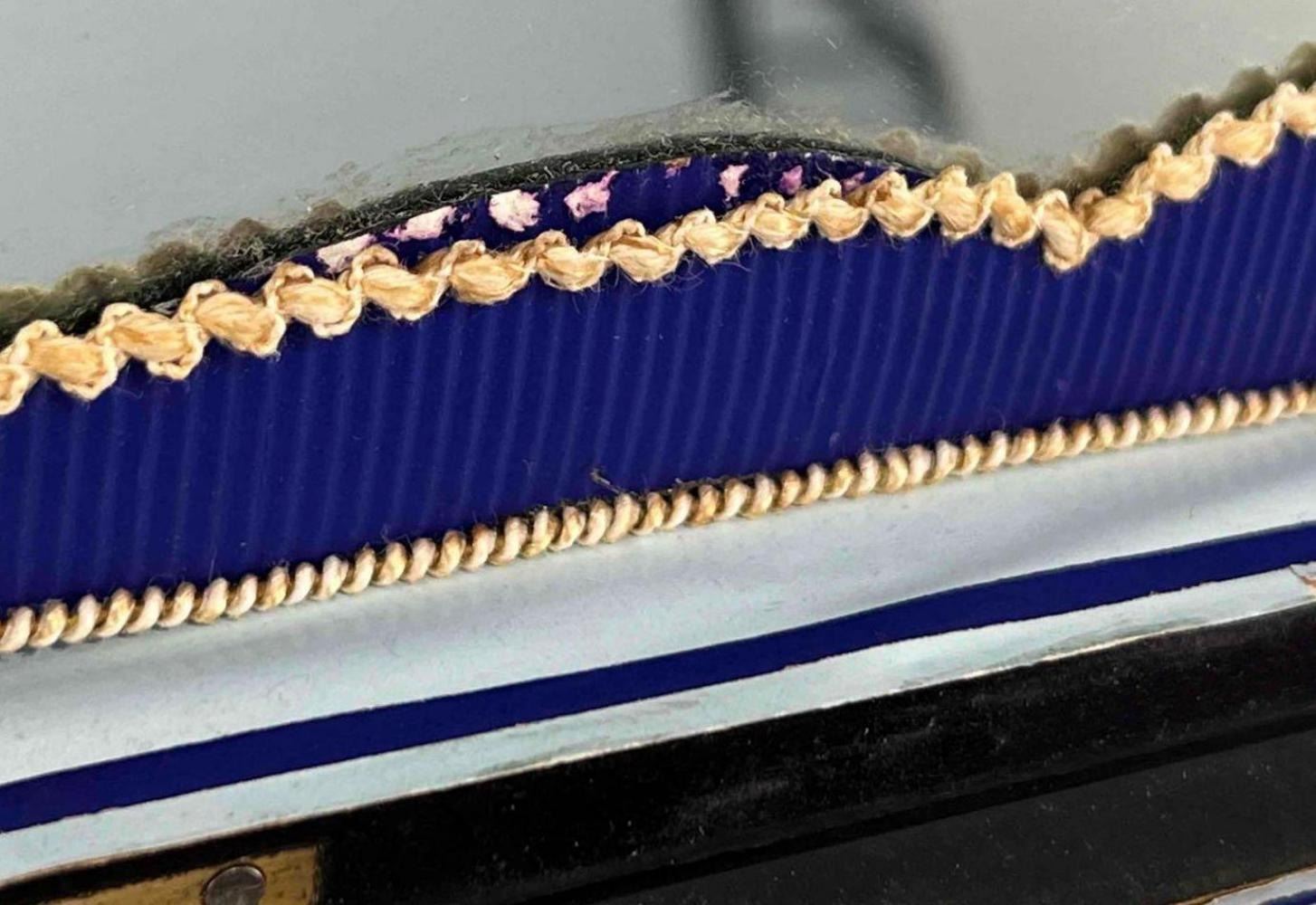 Antique Victorian Sewing Box With 9 Highly Decorative Pieces Of Sewing Equipment Including Scissors, Needle Box, Needle Threaders, And Bobbins. Includes Key. Box Approximately 9.5 L x 7 W x 3.75 D Inches. Smallest Item Approximately 0.5 L x 025 W x 0.25 D Inches.