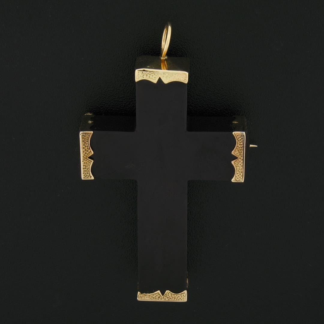 An antique solid 10k yellow gold cross brooch pendant, featuring 1 cross shape natural black jet (44x29.4mm ). The pendant weighs a total of 8.90 grams, measures 54.40x32.40mm including the bail, and the inside of the bail measures 5.3mm.