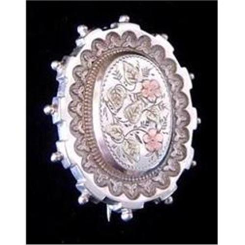 Bezel in back opens for insertion of photo or lock of hair. Flower and leaf motif. Can be worn horizontally or vertically. In excellent original condition.