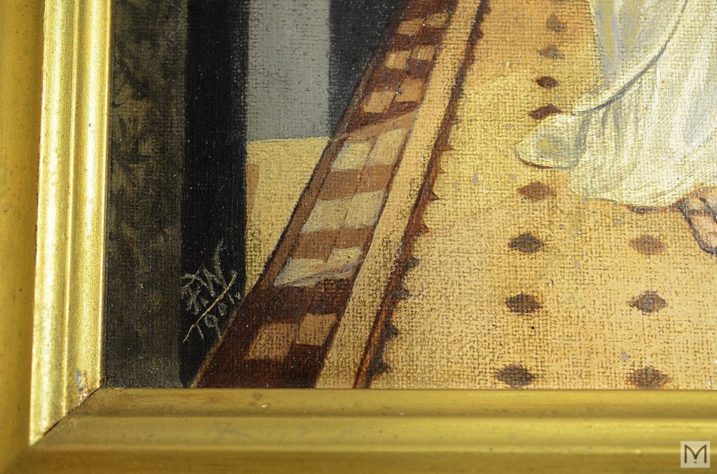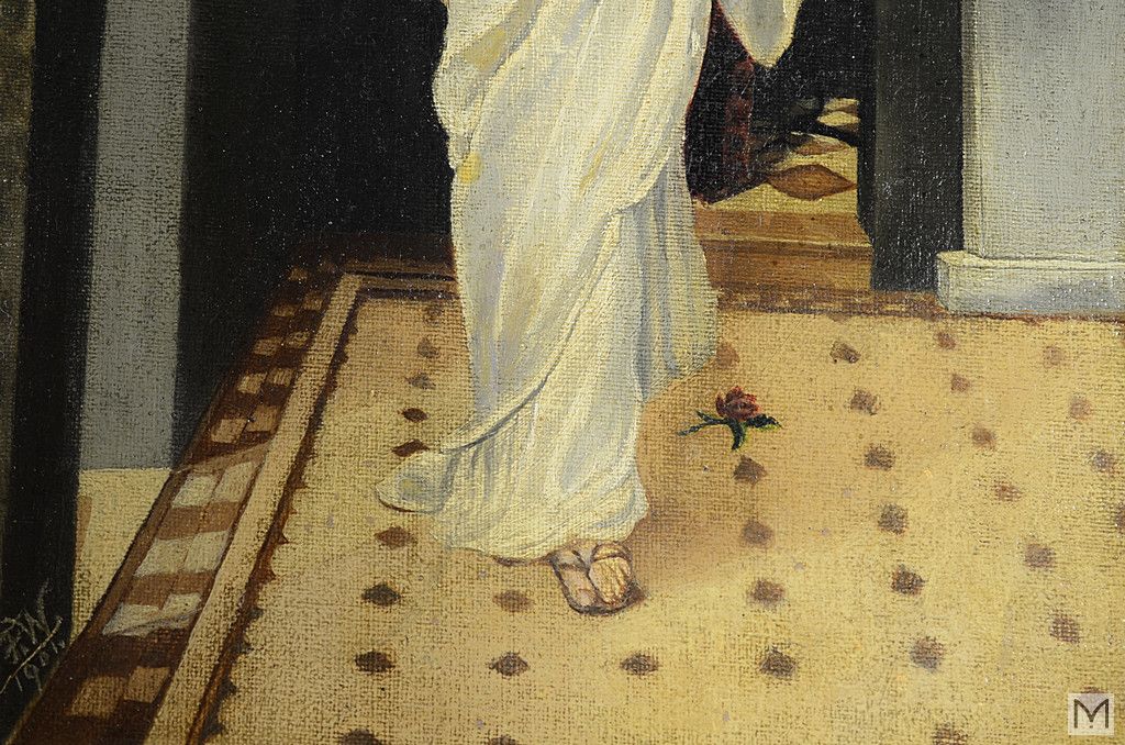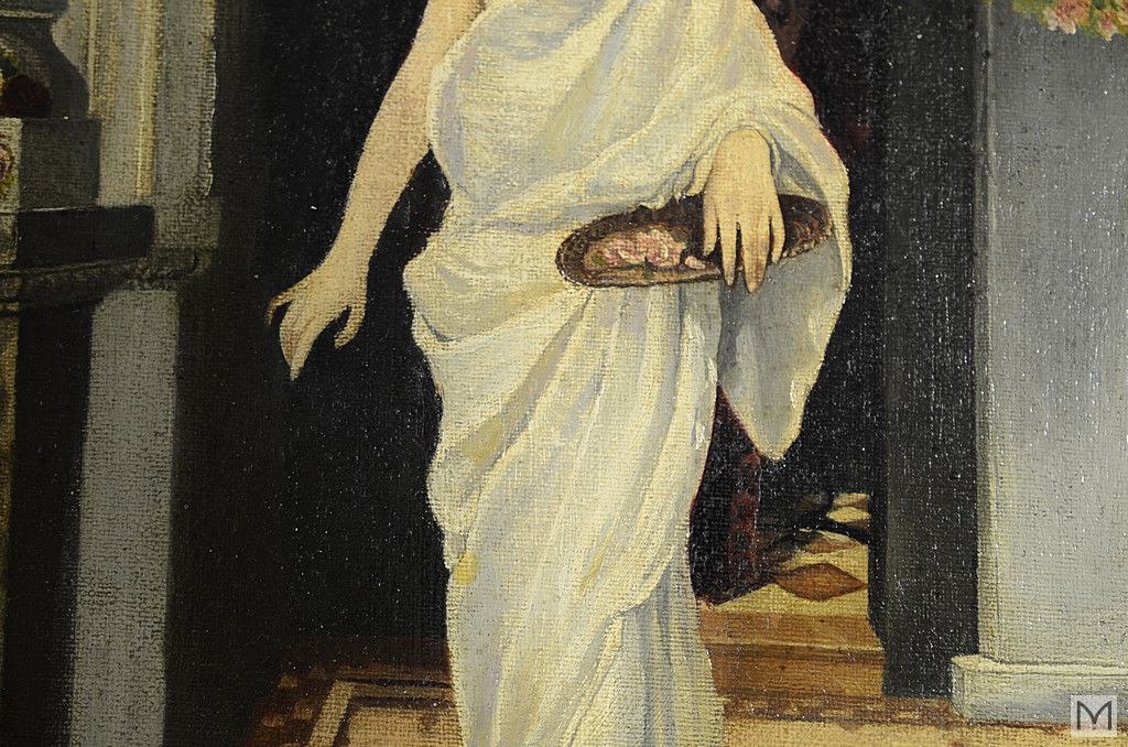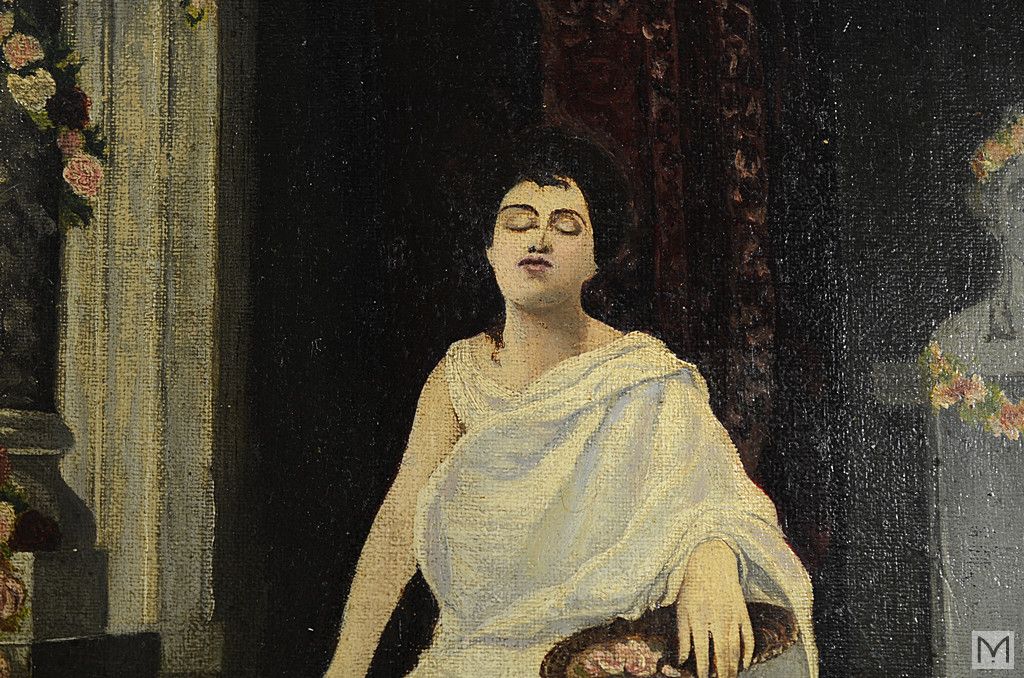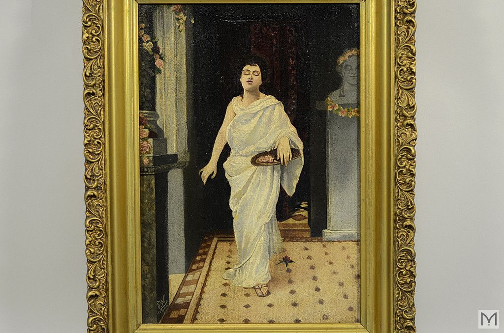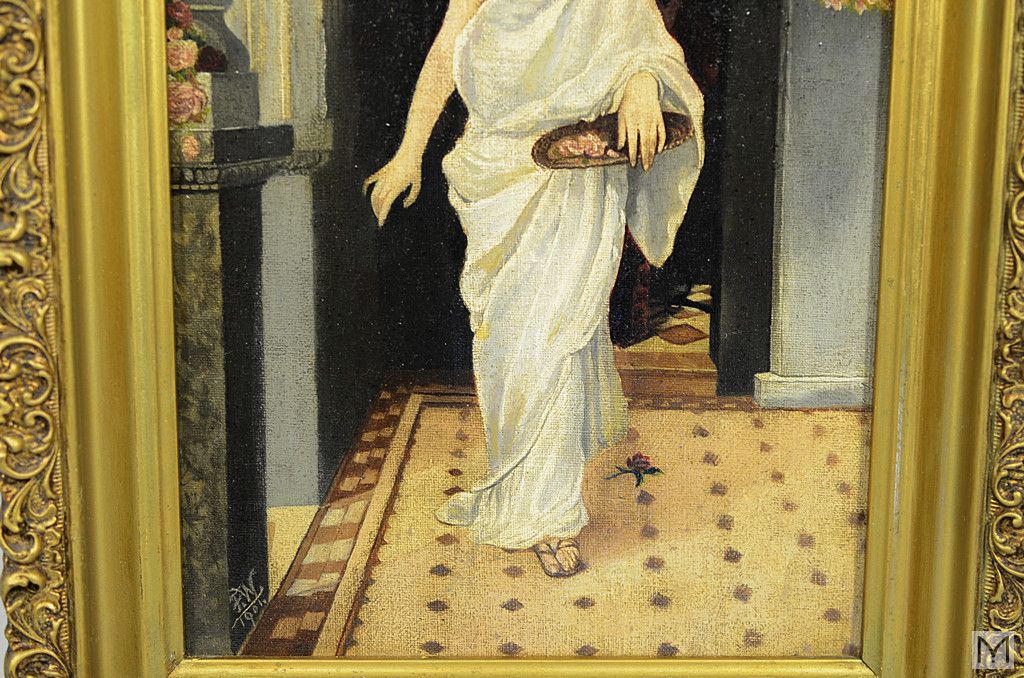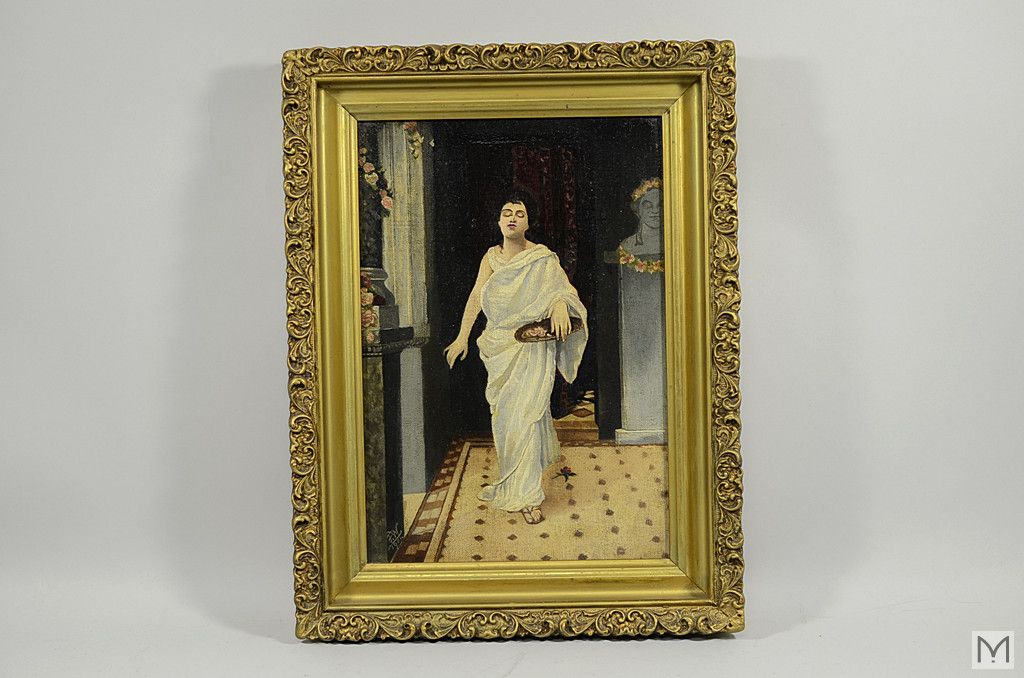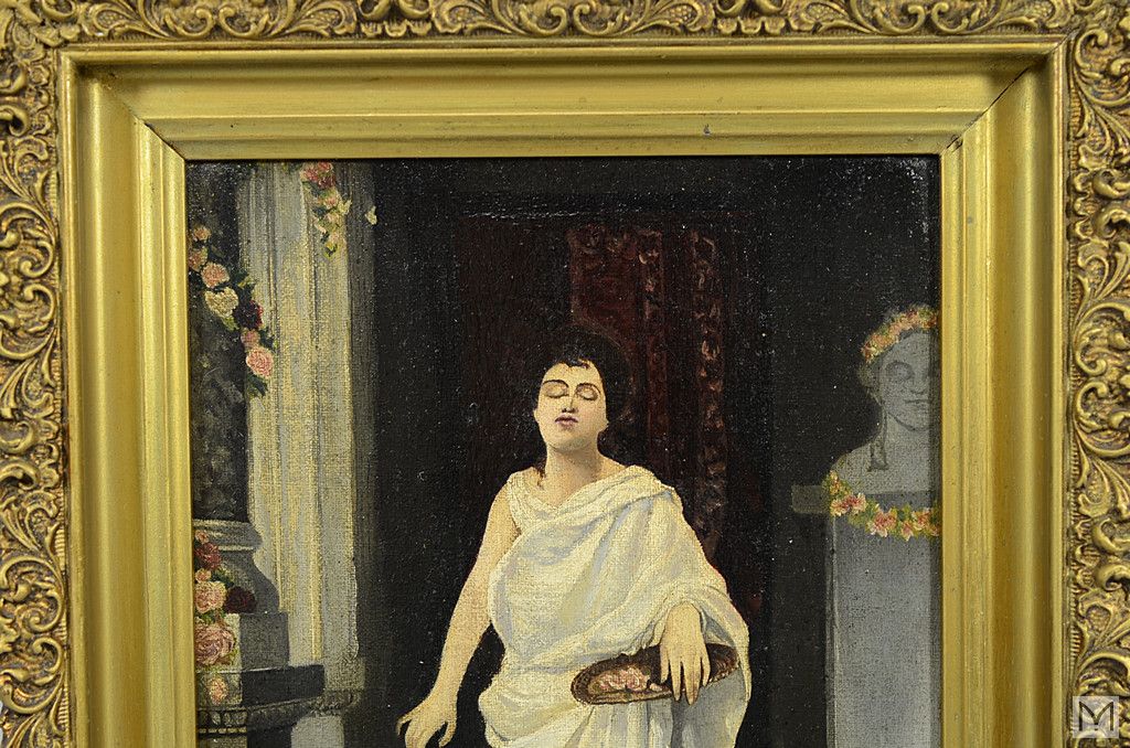 Antique Victorian Oil Painting on Board of Roman Temple Maiden. Inscribed on Reverse: Copy of 'Nydia' -- Signed/ Initialled: FW 1901