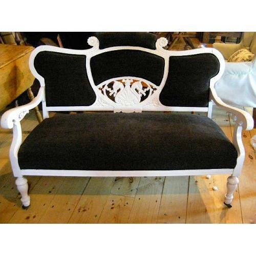 a beautiful victorian setee with wonderful detail. piece has been re-upholdstered in a rich black velvet. notice the dragon in center which was covered up with the old fabric...what a find!