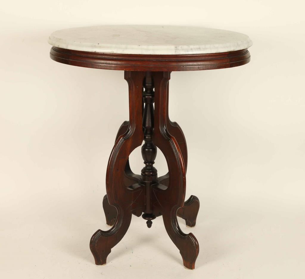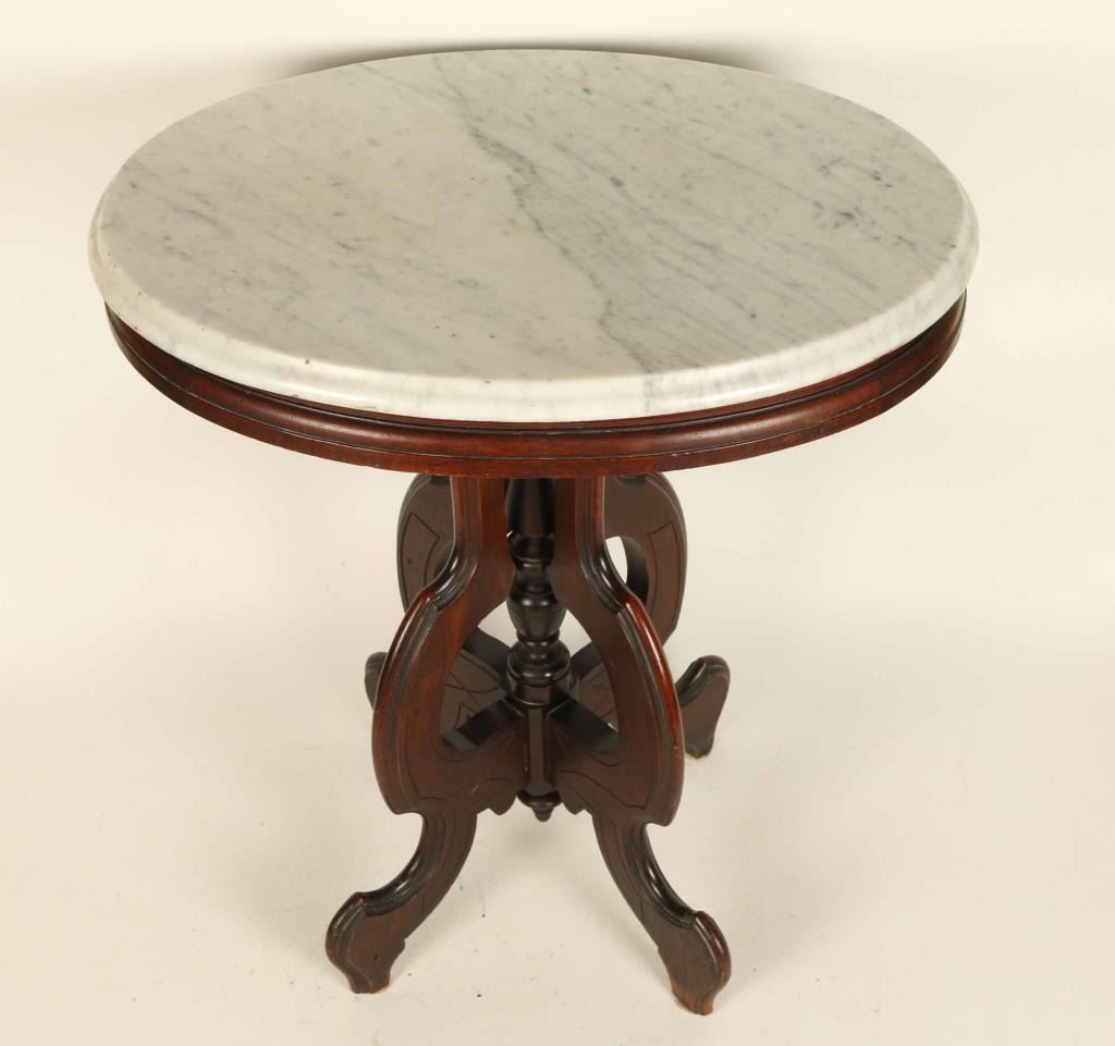 Oval shaped side table with mahogany base and marble top. Measures 26 1/2" tall by 22" by 17"
