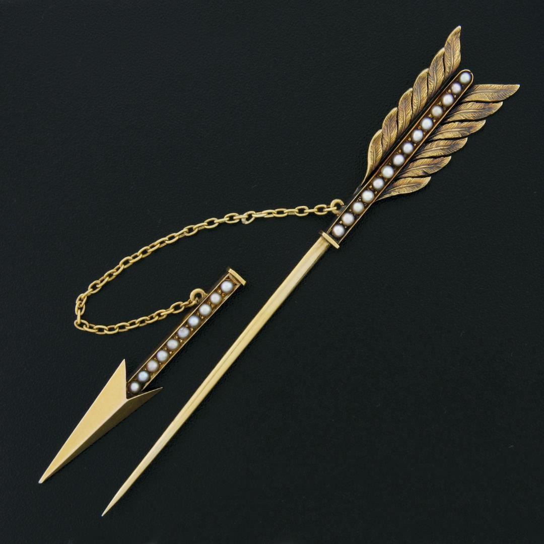 An antique solid 14k ylelow gold stick pin brooch, with 24 round shape cultured seed pearls (1.7mm to 1.9mm each). Measures 89.9x13.1mm and weighs a total of 5.71 grams.