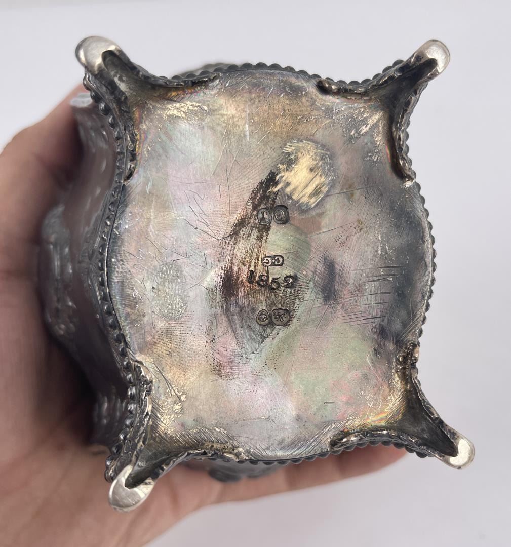 Very nice piece. Hallmarked on the base as shown. Also dated 1852. 6" tall. 346 grams.