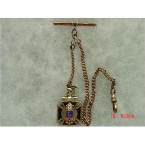 Here is a vintage Watch chain and watch fob. I know this enameled crown helmet and initials go to one of the organizations but I dont know which one. Anyone out there know please email me so that I may correct this. I recently acquired some watch chains and watch fobs and I am listing them in several lots, I do not know much about them and selling them exactly as I acquired them, This one measures 10 inches long The clasp is signed 52 or something like that? I dont know what the material is?