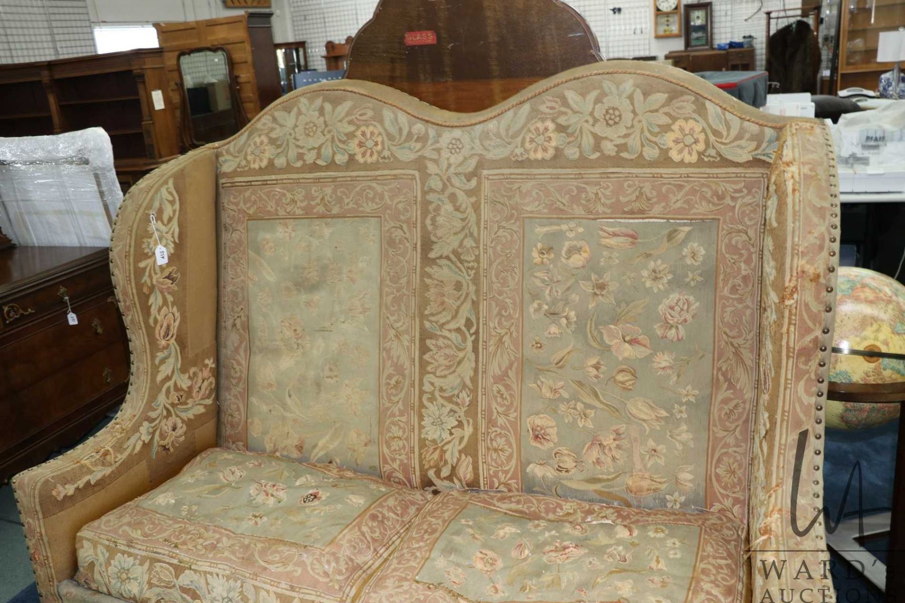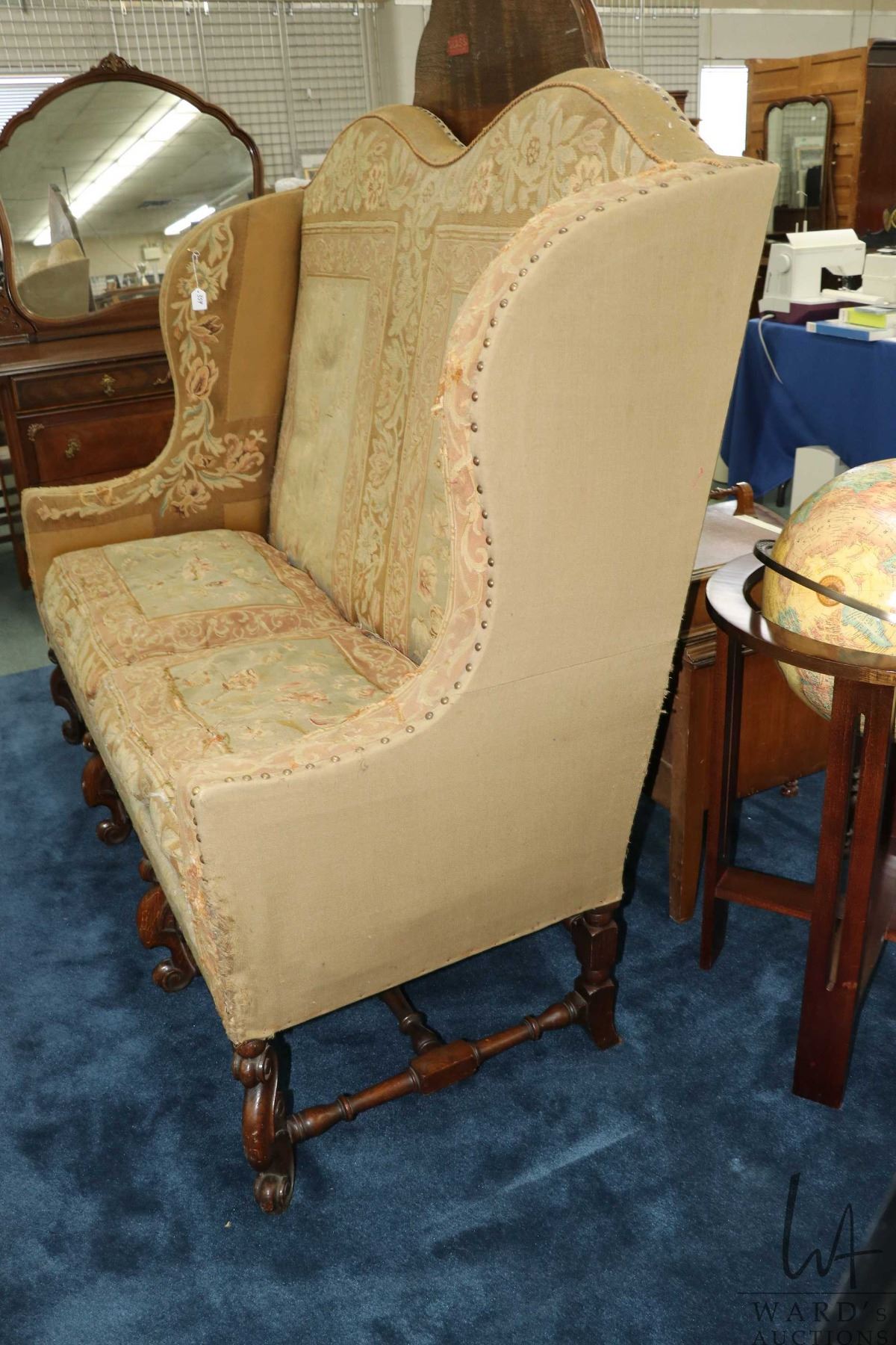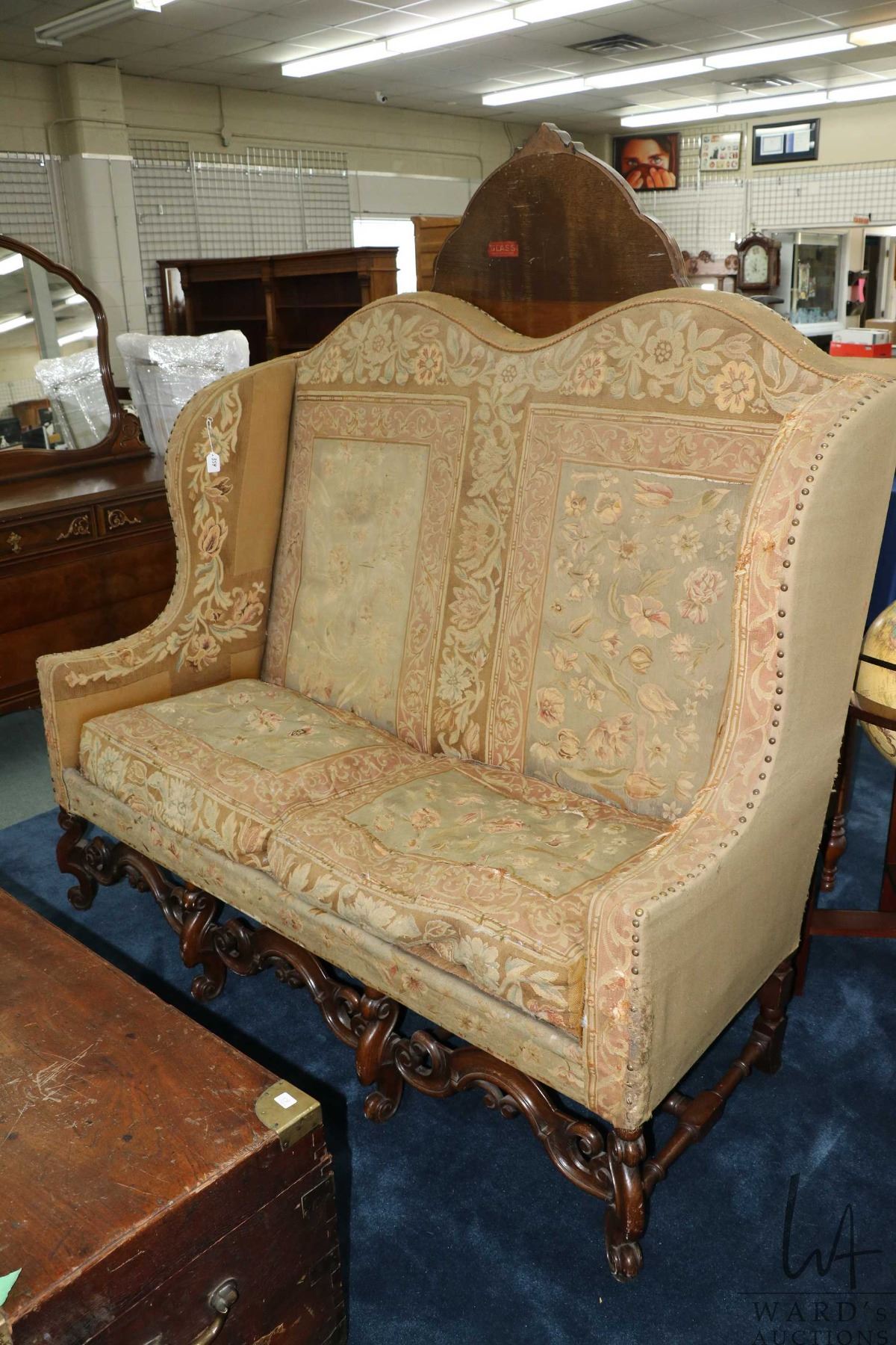 Antique Victorian copy of a 17th century camel back enclosed sofa with oak trestle base, two feather filled cushions and original Victorian floral motif upholstered panels, needs tlc, 57" H X 66" W X 30" D