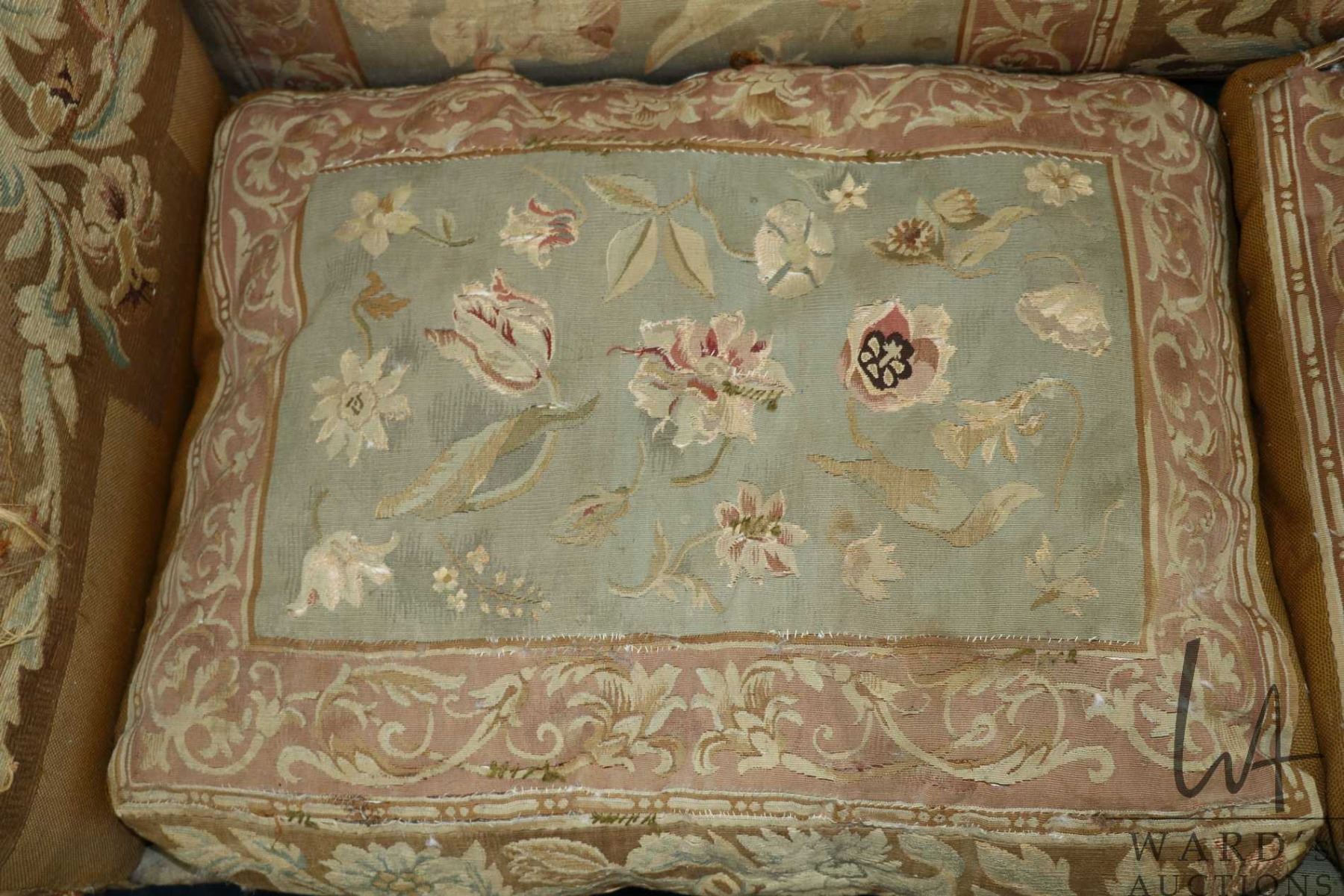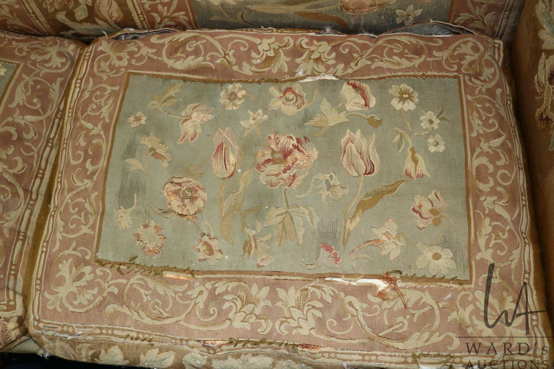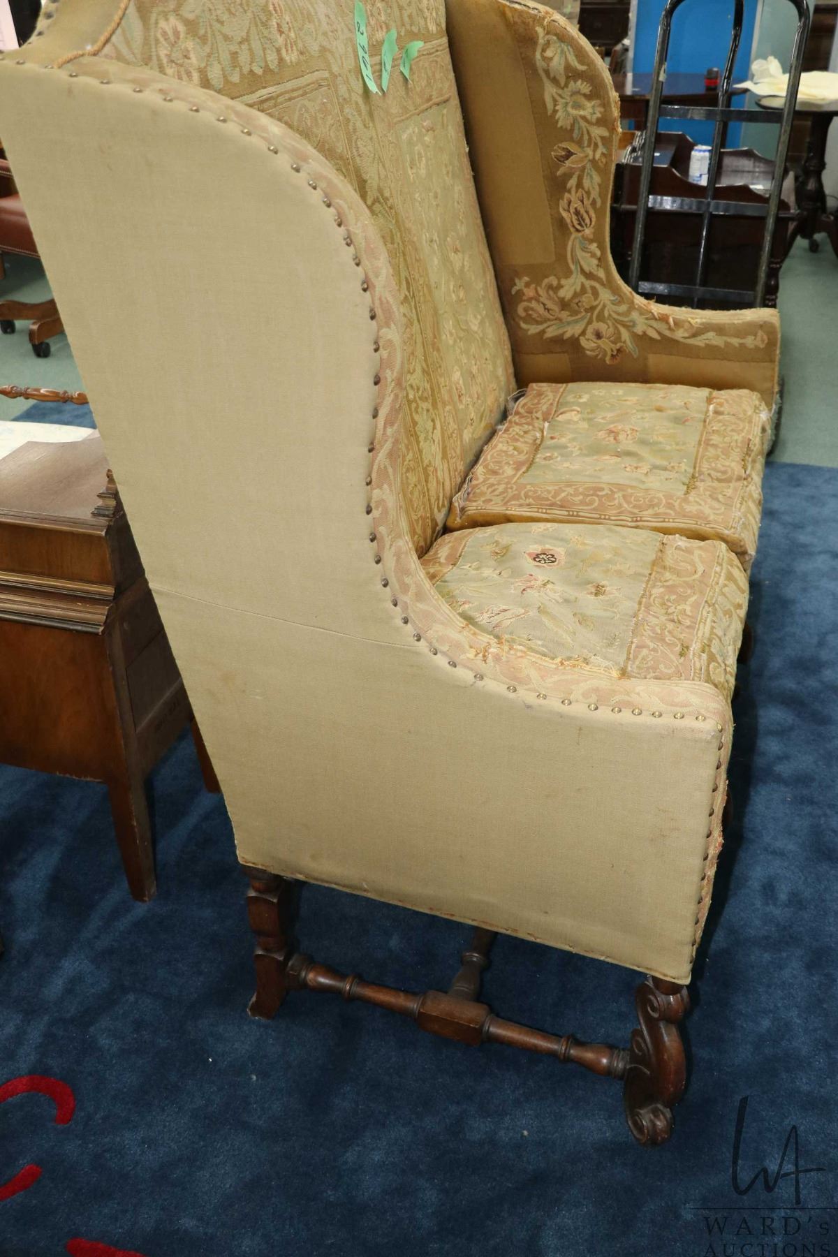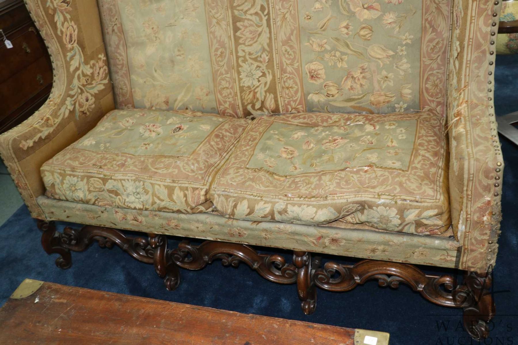 Antique Victorian copy of a 17th century camel back enclosed sofa with oak trestle base, two feather filled cushions and original Victorian floral motif upholstered panels, needs tlc, 57" H X 66" W X 30" D
