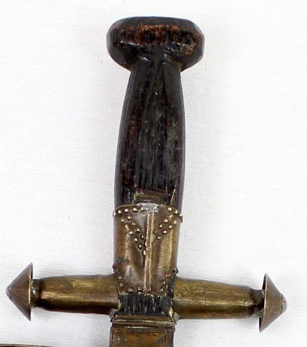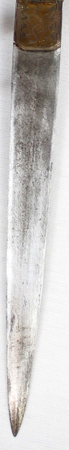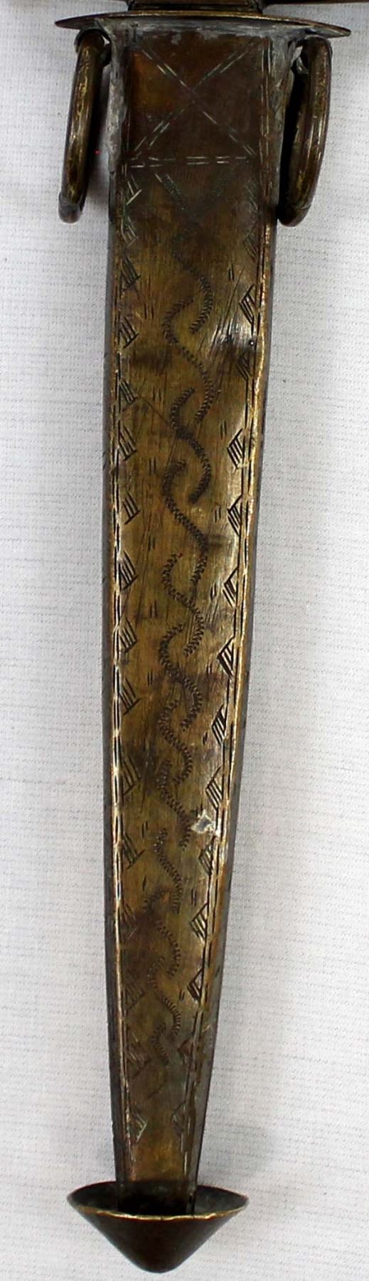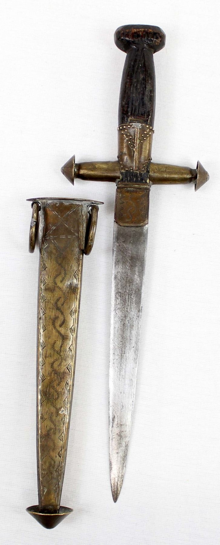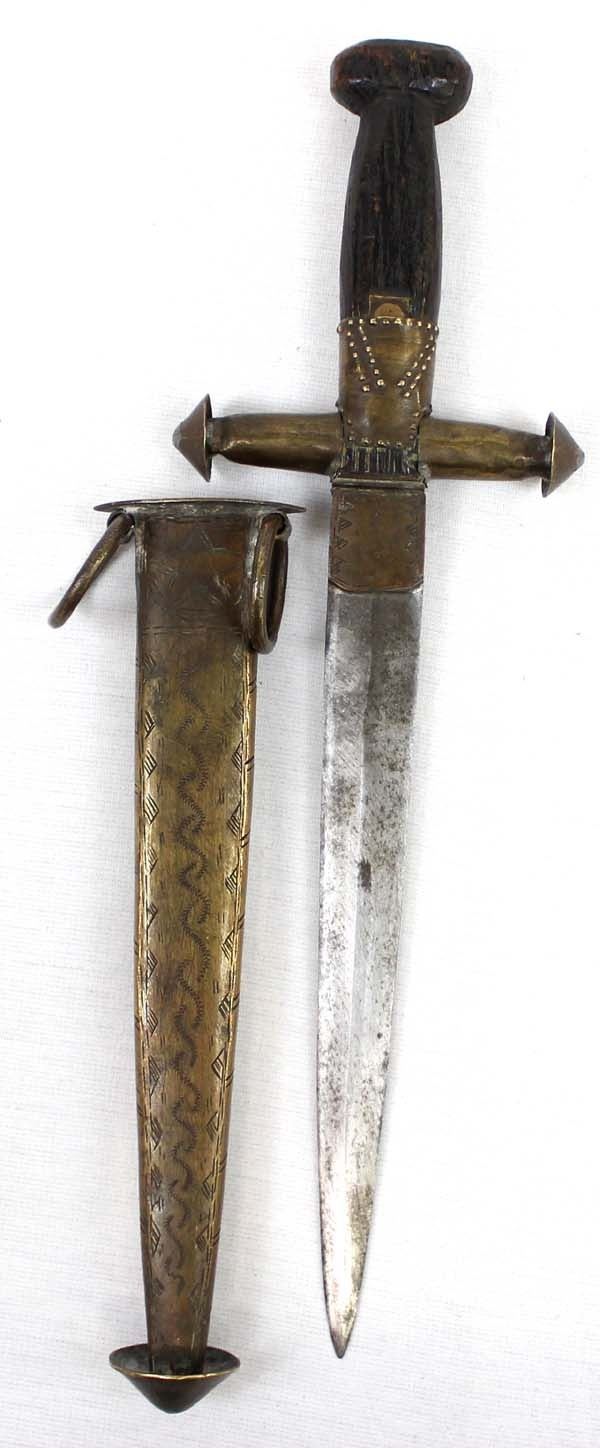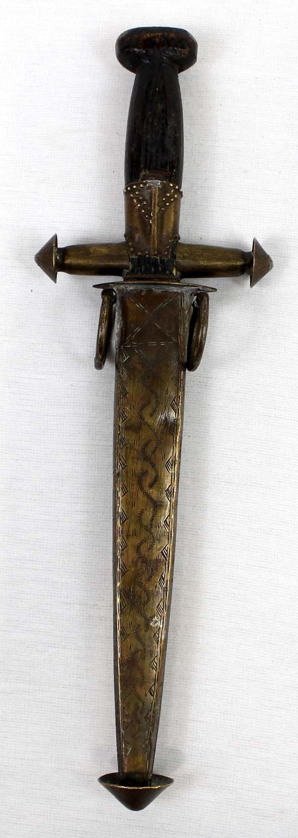Antique Vintage Dagger in Scabbard, blade measures 8'', handle measures 4'', overall dagger measurement of 12'', dagger in sheath measures 12.5'', the sheath and cross guard appear to be made of copper, sheath has intricate engraved designs, the rain-guard has the engraved letters SS, the handle is carved wood, truly a unique dagger