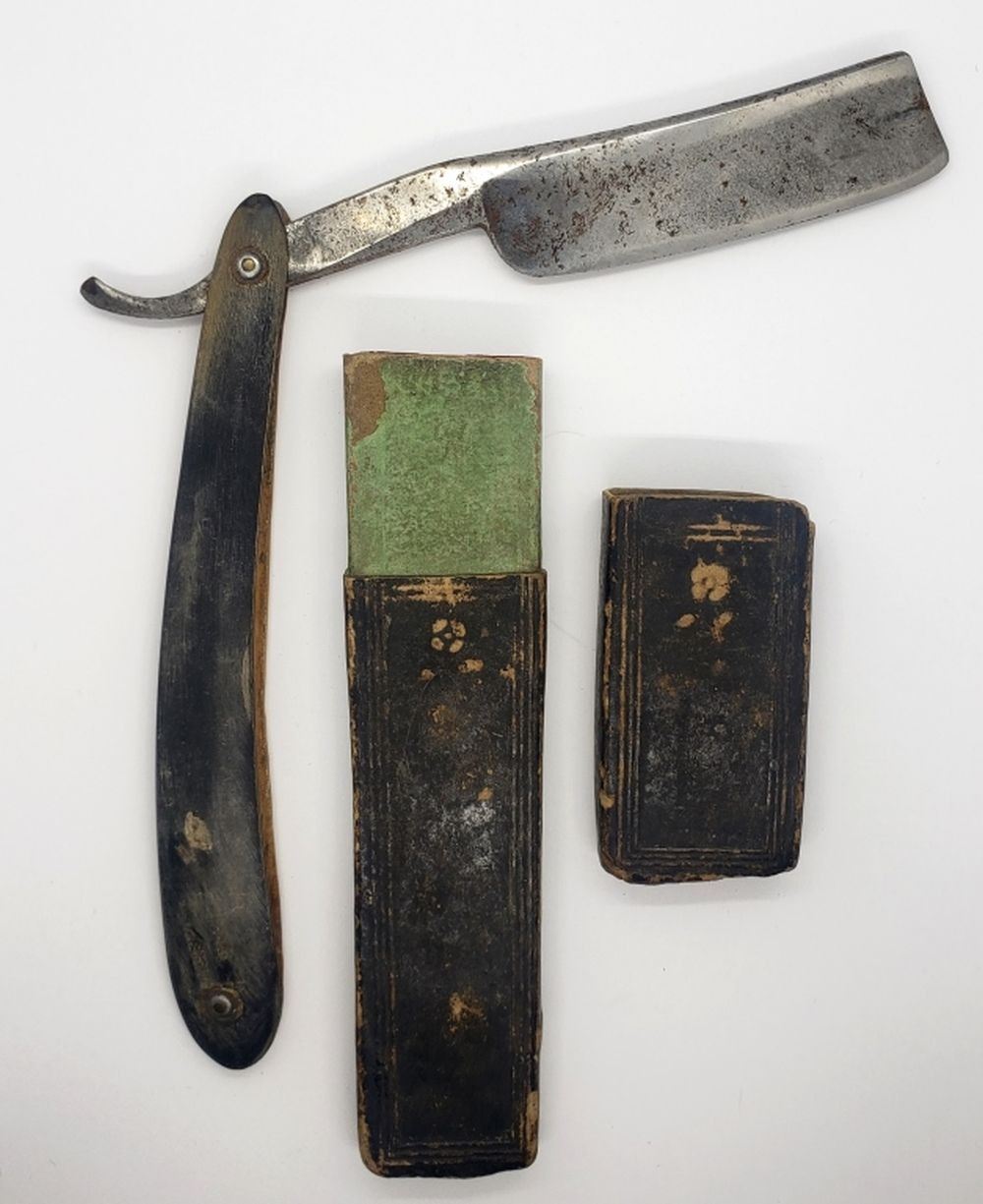 Has surface rust and needs a good cleaning. One side may have been replaced as it is a different color wood. Has been sharpened many times. Has razor box. Unsure If it is orriginal. No cracks at the screws.