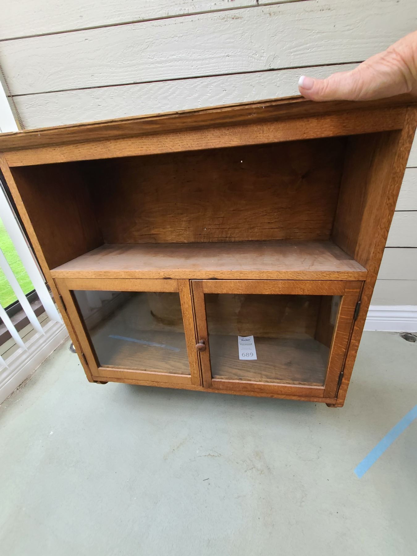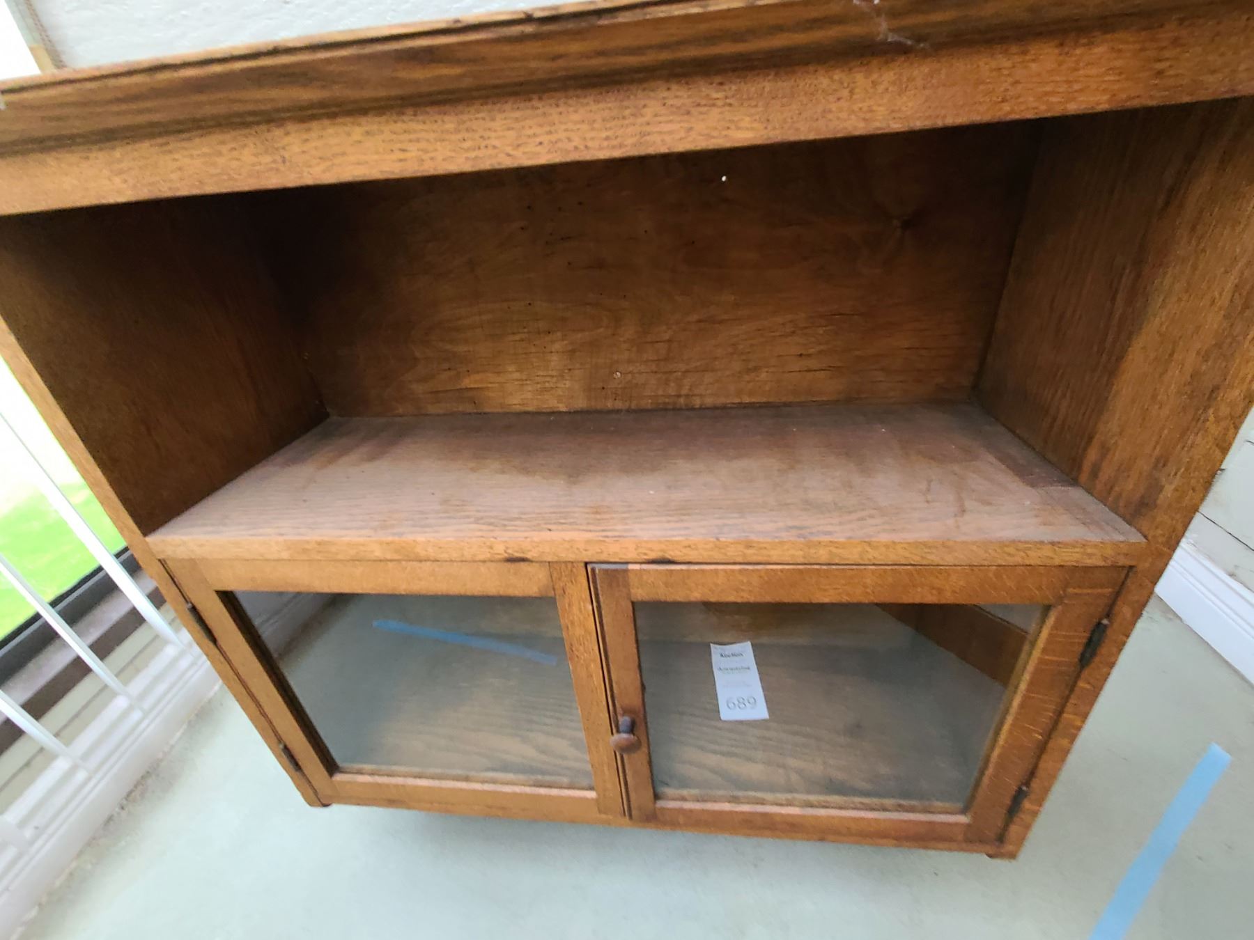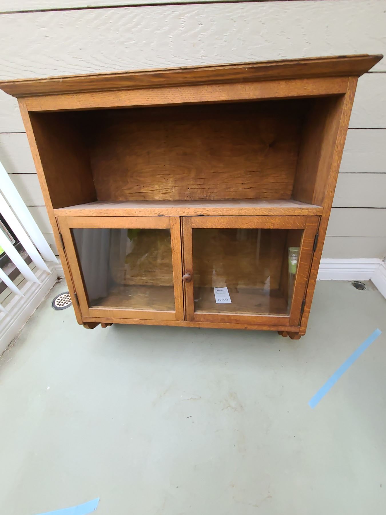 Antique wood wall cabinet 29x10x29. Top is well worn. Pickup at 9 am.
