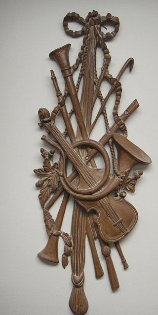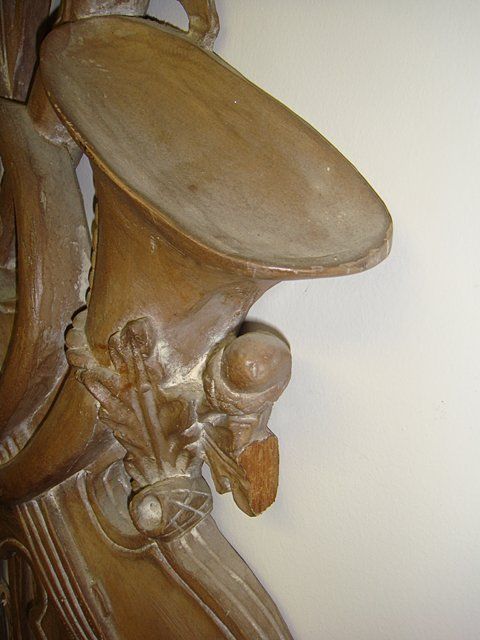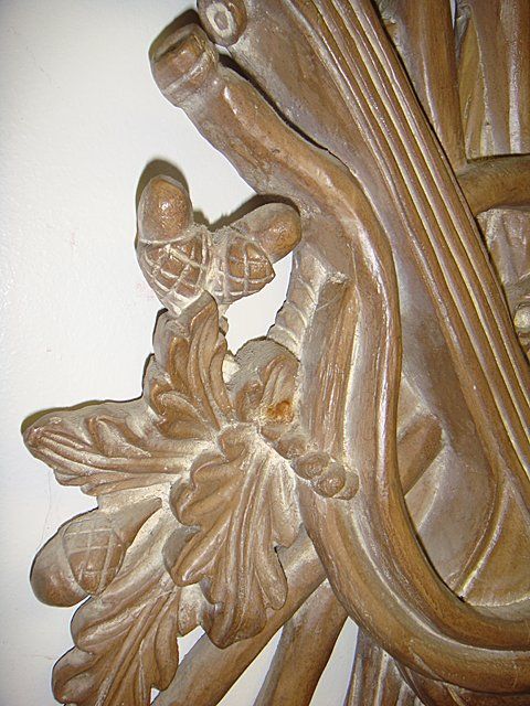 Antique Wall Carving with horn, trumpet and acorn. One small piece on right hand side below the acron missing by the leaf. Measures 41 inches tall x 16 in wide.