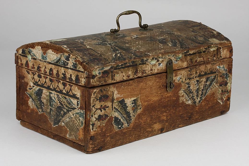 One antique pine wallpaper box circa 1800s. The box features handmade square nail heads, original brass handle and catch and domed with original brass hardware! Very Collectible! Measures 12" W x 5.5" H x 6.75" D. Valued between $900 - $950.