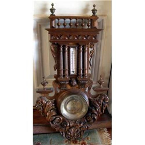 Finely carved American walnut barometer wall piece. c. 1890. h. 26" w. 14" d. 6"
