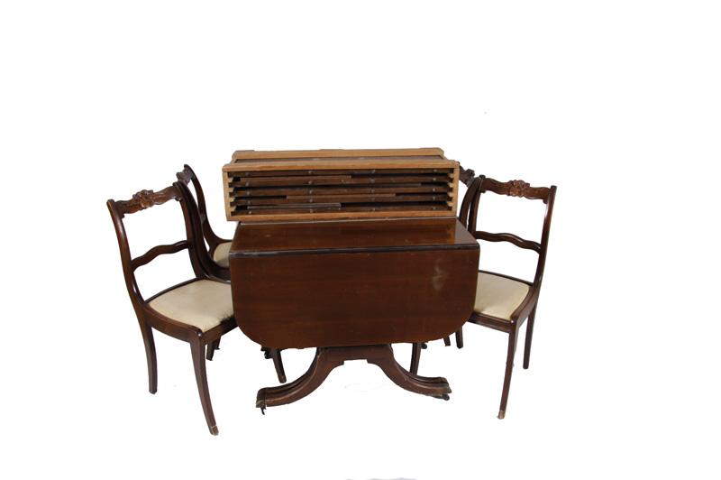 Antique Walnut Dining Room Table Table has drop sides and includes 5 leaves and table pad, four matching chairs that have floral back carving. In overall good condition, has some scratches and need a light refinishing on the table top. The chairs are stuTable has drop sides and includes 5 leaves and table pad, four matching chairs that have floral back carving. In overall good condition, has some scratches and need a light refinishing on the table top. The chairs are sturdy and in goodcondition but do need to be reupholstered. 124" length when all 5 leaves are installed.