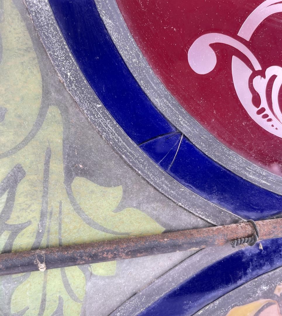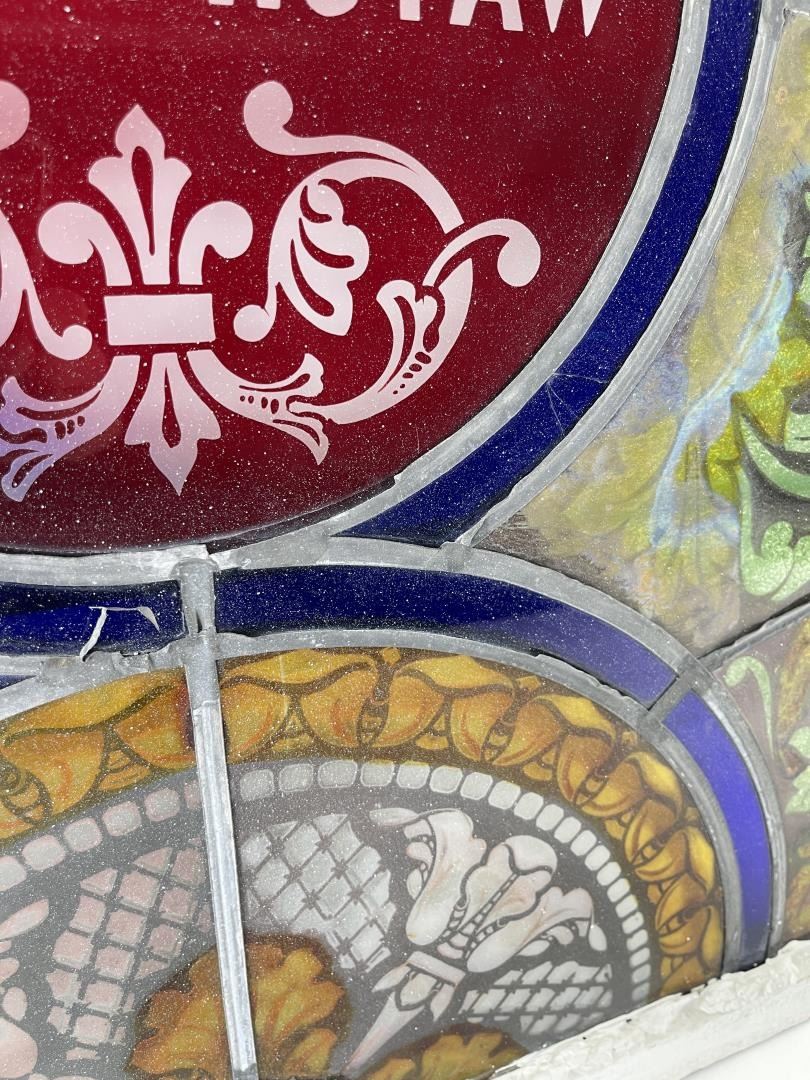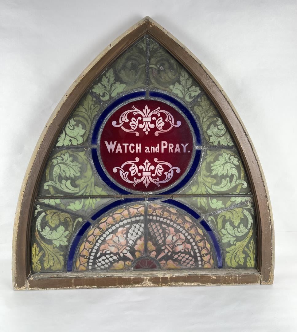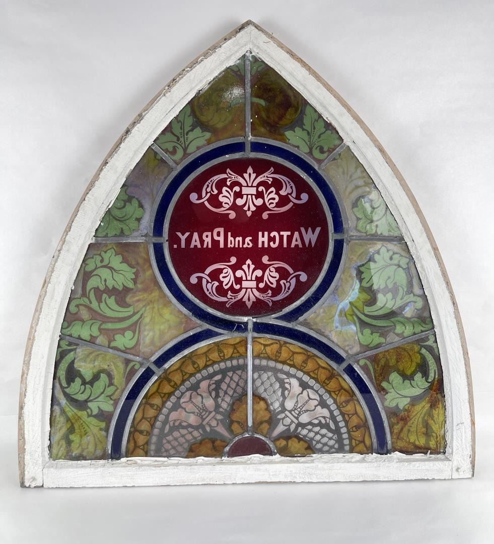 Beautiful old Stained Glass. Came out of a church that was Built in 1842. 36" tall, 36" long. Will be expensive to ship.