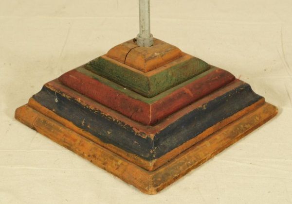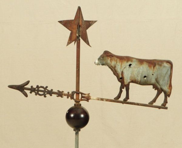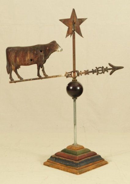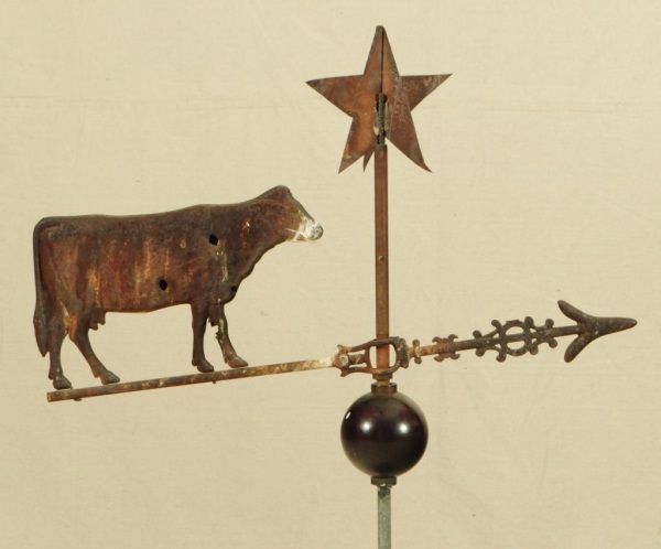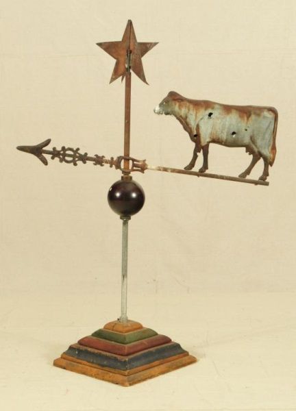Antique cow weather vain with star on top and black painted glass ball in center and painted wood base. Approx 30" wide x approx 42" tall.