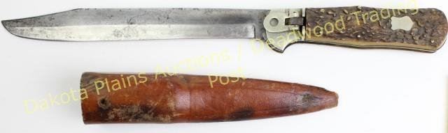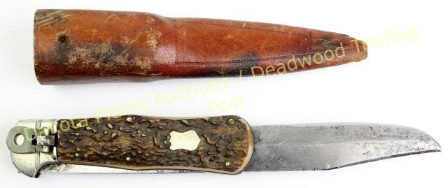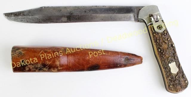 with stag handles, 7" clip point blade and original sheath with is missing nickel silver tip and belt loop, otherwise very good. Est. 200-400