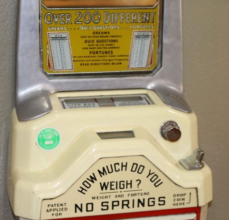 Circa 1940s-50s penny scale with "How Much Do You Weigh? No Springs" and "Over 200 Different Quiz Questions, Dreams, Fortunes". Metal and glass construction. Measures 15 1/2"l x 64 1/2"h x 24 1/2"w. Watling Scale Co. Chicago. Good condition. Due to size and weight of scale buyer must make their own shipping arrangements.