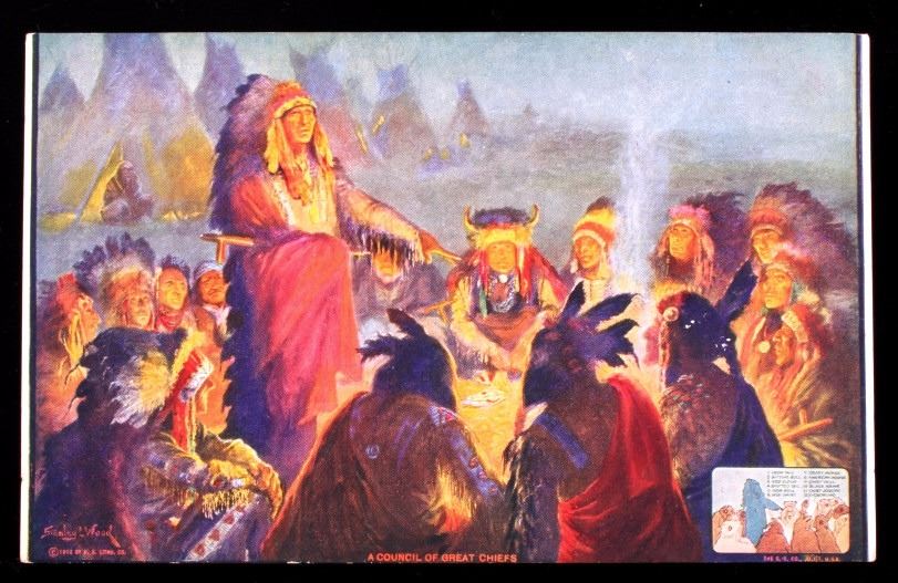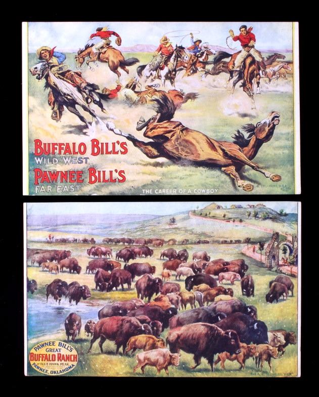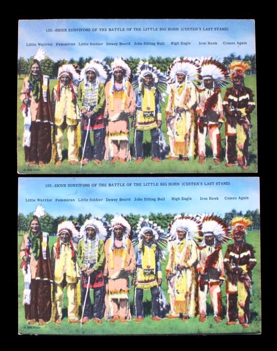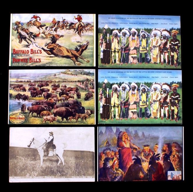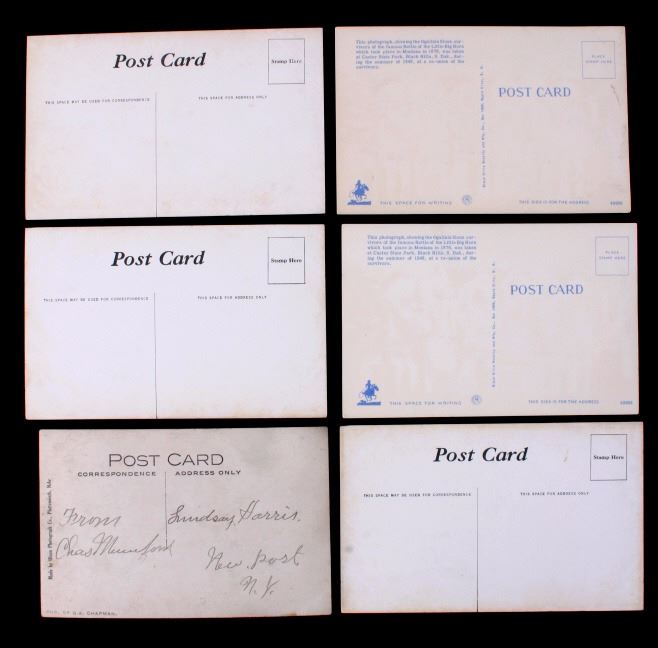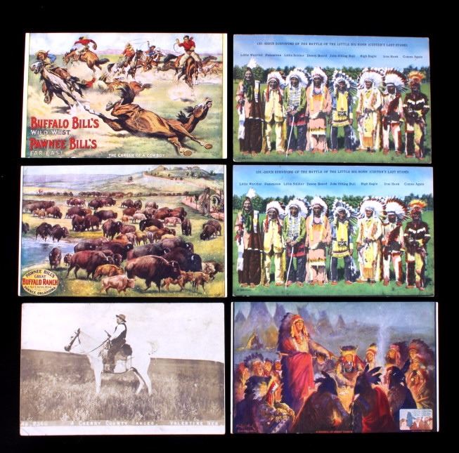 This is a collection of six antique postcards. Included are (2) Sioux Survivors of the Battle of the Little Bighorn, (1) Pawnee Bill postcards, (1) Buffalo Bill & Pawnee Bill Postcard, (1) Cherry County Ranger real photo postcard, and one Council of Great Chiefs" postcard. All the postcards are in good condition. The Cherry County Ranger is the only one that has been written on. Each postcard measures 3.5" x 5.5".