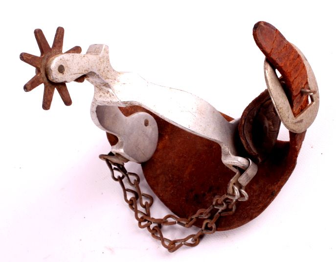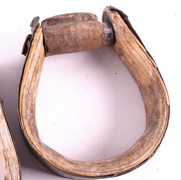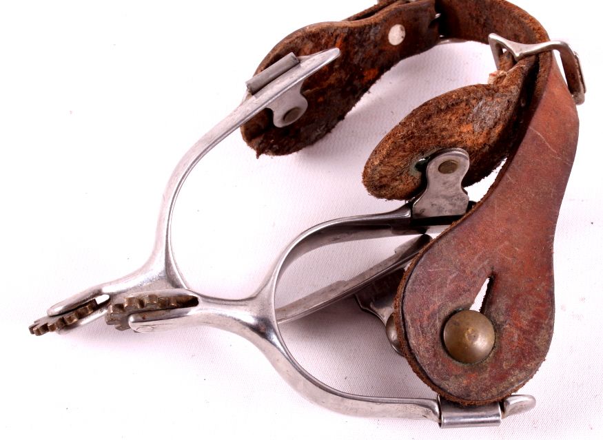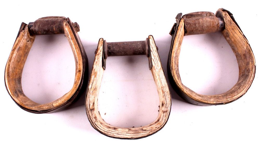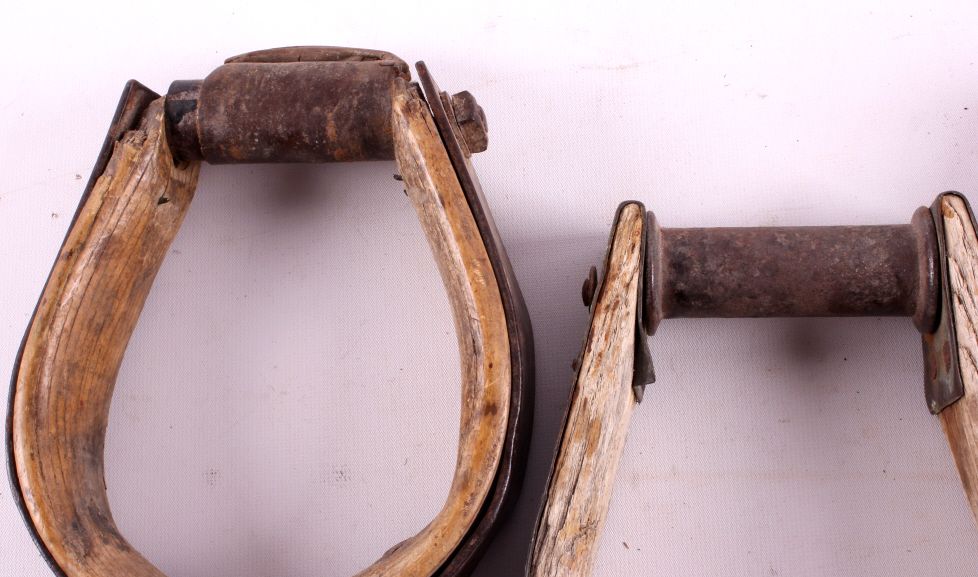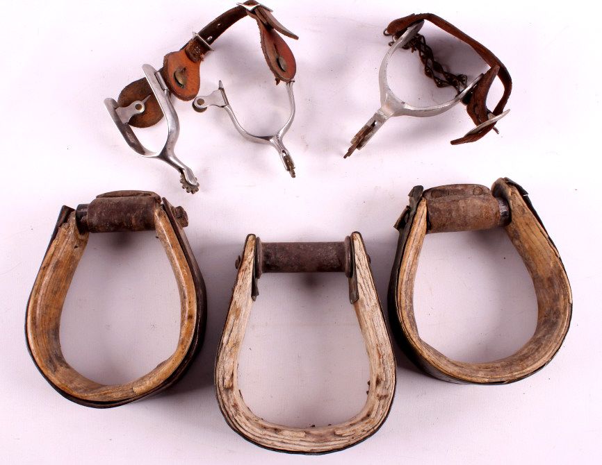 This is a western spur and stirrup collection. There is one pair of matching spurs and one single spur. The stirrups are made from wood and steel. The spurs and stirrups are in good condition.