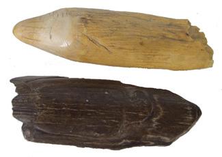 An old well handled whale's tooth and a section of fossilized bone with an eagle carved in it. 8" x 3", 7" x 3"