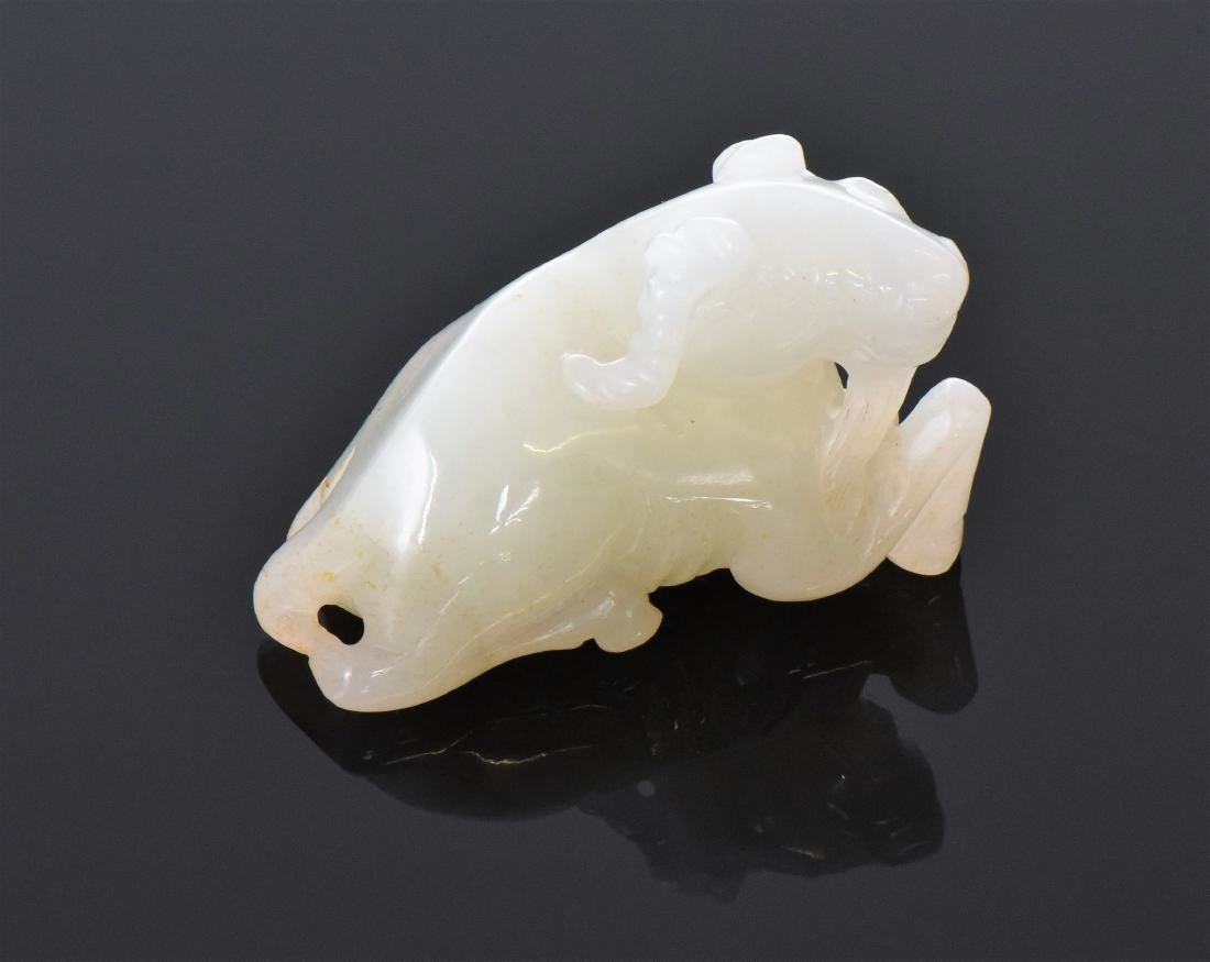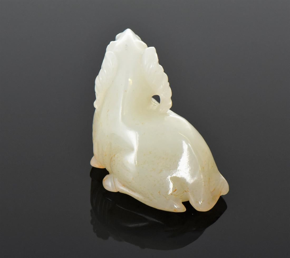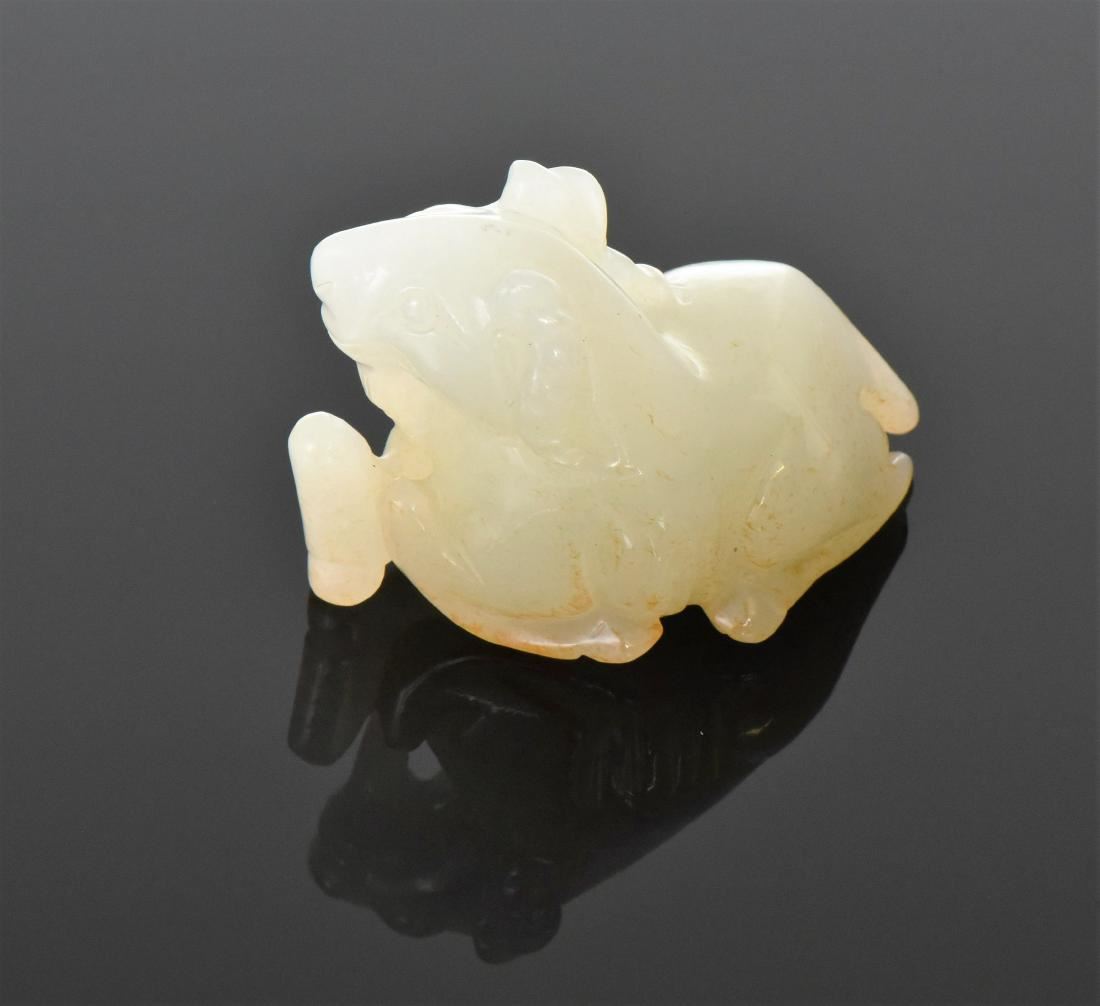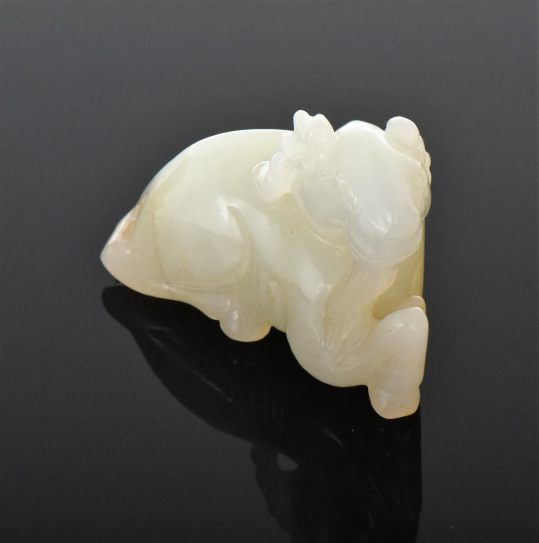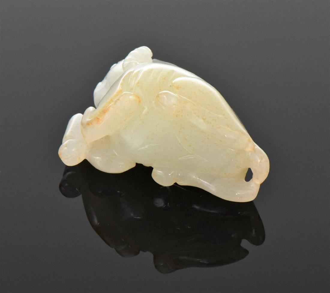 Antique White Jade Recumbent Ram, Qing Dynasty. Pangaea Auctions Guarantees This Item As Authentic Jade. Provenance: The Chen Collection, New York. Estimated more than 200 yrs old. Jadeite is called Yingyu in Chinese, with a Mohs hardness of 7; its pressure bearing capacity is must greater than the diamond, belonging to the category of pyroxene. Jadeite integrates the beauty of jade and brilliance of a gem. Its colors are very mysterious and enigmatic, elegant, pure and soft. Jadeite is bright in color, with a glass gloss oily appearance and a high transparency in upwards of 3mm to 5mm light penetration. It is hard enough to cut glass and is cold to the touch. There are multiple grades of Jadeite. 1. Glass Jadeite; the best jade species, featured by the highest transparency, almost entirely transparent. It contains fewer inclusions comprised of impurities and is crystal clear. 2. White Jadeite; fine in texture with common transparency and white as snow. Often with a fibrous structure most of which is opaque with maximum light penetration up to 1mm depth. Typically used for bracelets, carvings and pendants. 3. Flower Green Jadeite; is in vein distribution, grounding by light green and other colors, in coarse and refined texture. It is a more widely distributed species and is classified according to the color distribution status varying from sparse and intensive and the color ranging from dark to light. 4. Oily Green Jadeite; refers to the dark emerald green with it color not pure green, but with gray and a tone of blue varying from light to dark. Good transparency and the surface has an oily sheen due to different degrees of green shades. It is referred to as "Rind Oily Green" in dark color and "Fresh Oily Green" in light color. Size: See Ruler Photo. (Photos Represent The Condition Of The Lot.)