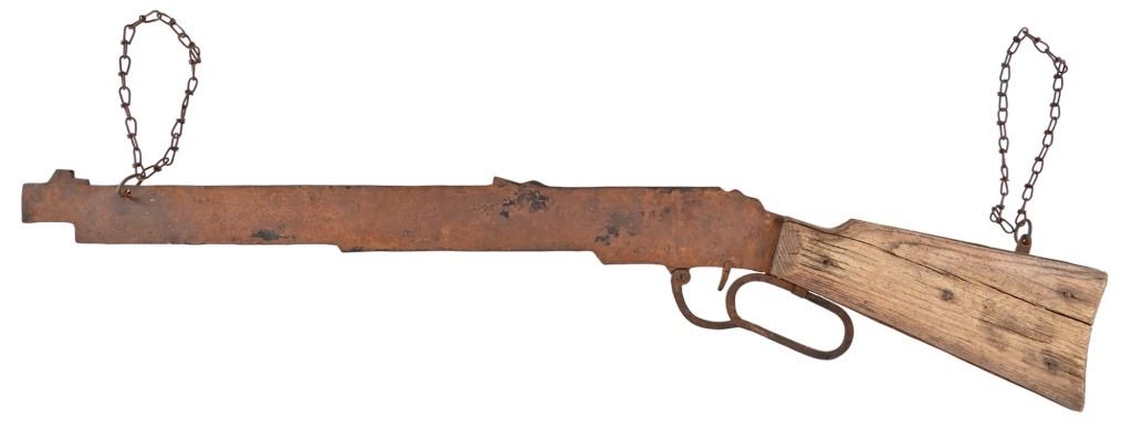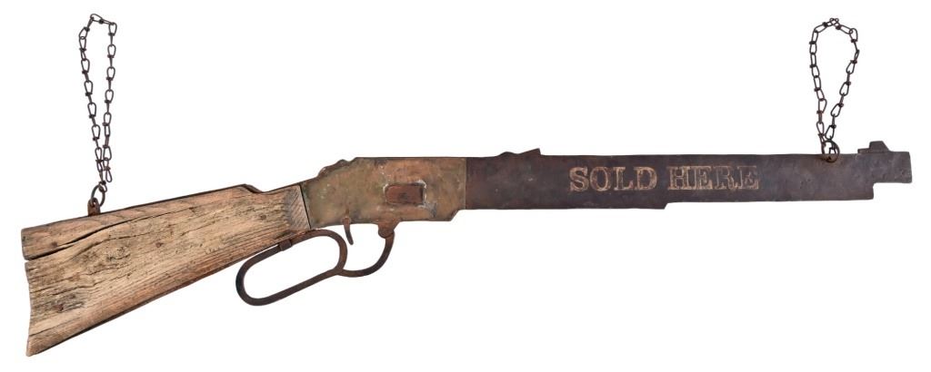 Hand cut & hand forged. Real brass overlay on receiver, real wood buttstock mounted with hand-forged nails. Recessed stamped lettering "Sold Here", with hand painted accent. Measures 9" x 54"