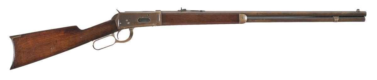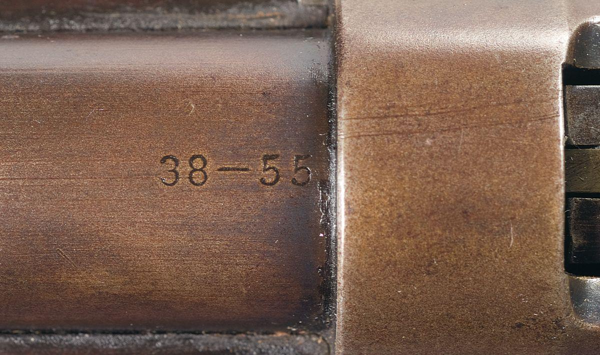 Made in 1896. Lyman blade front (minus bead) and semi-buckhorn rear sights. Standard markings. Replacement extractor. Full length magazine tube. Smooth straight grip stock with carbine style buttplate.