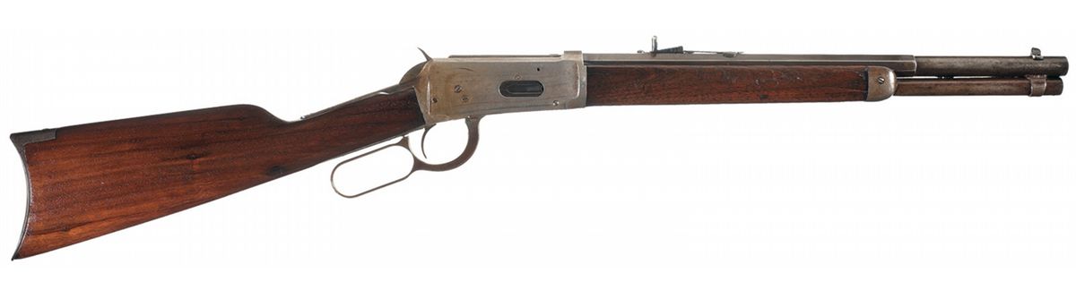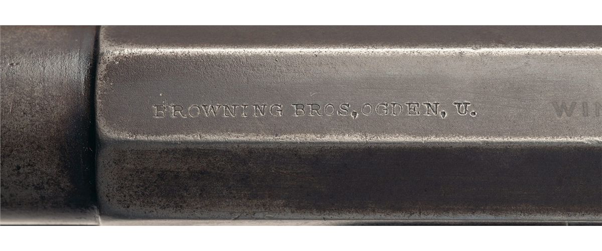 Manufactured in 1897. This rifle has had the magazine tube and barrel shortened to 17 inches, (5 1/4 inches round, the remainder octagon). The forward top flat is marked "BROWNING BROS, OGDEN, U." followed by "MANUFACTURED BY THE/WINCHESTER REPEATING ARMS CO. NEW HAVEN, CONN U.S.A." and the upper left rear flat is marked with the two line nickel steel/smokeless powder marking. The top flat at the breech is marked "30 W.C.F.", standard early style upper tang marking and the serial number is on the bottom of the receiver. Blade front and adjustable Marbles semi-buckhorn rear sights and mounted with a smooth walnut forearm and straight grip stock.