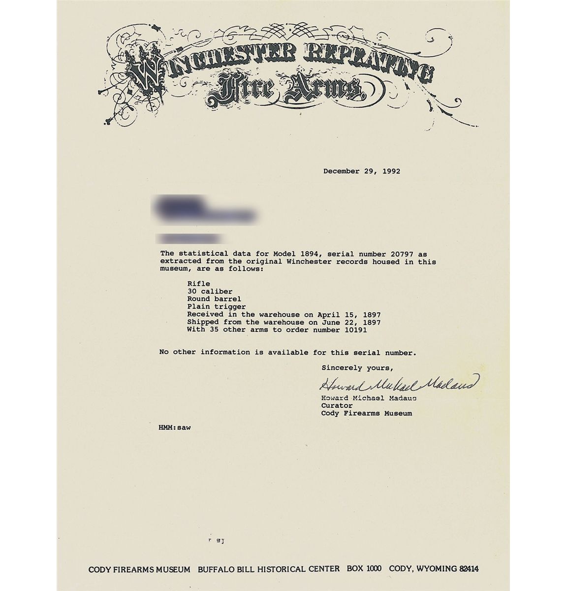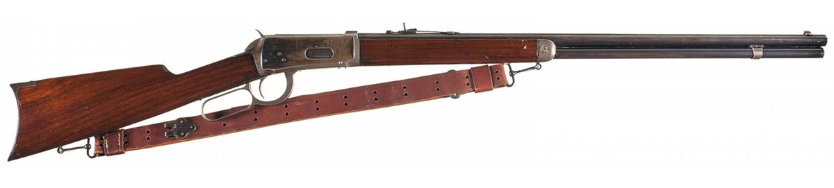 The included factory letter confirms rifle configuration, caliber, round barrel and plain trigger. The rifle was received in the warehouse on April 15, 1897 and shipped on June 22, 1897 with 35 other arms to order number 10191. The barrel has a blade front sight and an elevation adjustable rear sight and is marked with the two- line address ahead of the rear sight and "30 W.C.F." at the breech. The upper tang is marked with the three- line Model 1894 patent marking. Smooth forearm and straight grip stock with forend cap, leather sling and crescent buttplate.