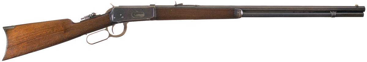 Manufactured in 1895. German silver dovetail blade front sight and adjustable semi-buckhorn rear sight, with the standard two line barrel address/patent date marking and "32-40" on the upper flat. Casehardened lever, with a flip-up adjustable peep sight mounted on the upper tang. Smooth straight grip stock with metal forearm cap, tapped hole for a sling swivel on the butt and a smooth carbine buttplate.