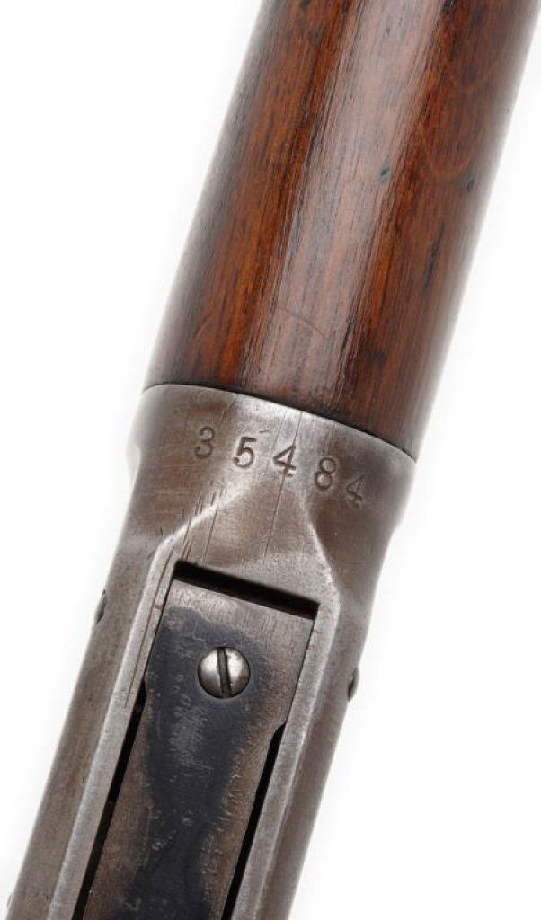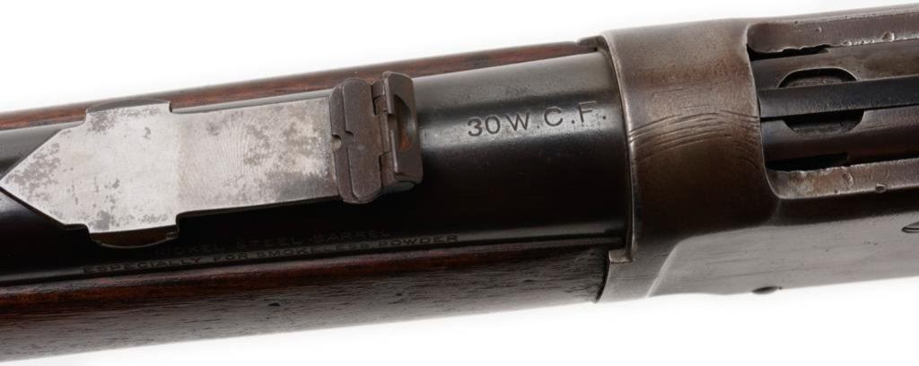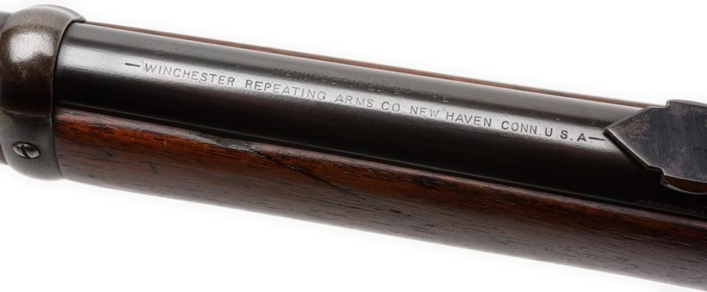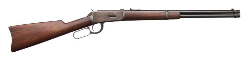 Antique Winchester Model 1894 lever action SRC, .30 W.C.F. caliber, 20” barrel, S/N 35484, blued finish, wood stocks. This Winchester is in overall good to very good condition displaying the majority of an old re-blued finish to the barrel and loading tube. The receiver shows a brown patina with inscribed initials “SJG” on the top tang behind the hammer. The action is crisp, the markings good and the bore overall good. The wood stocks are good to very good. Est.: $700-$1,400.