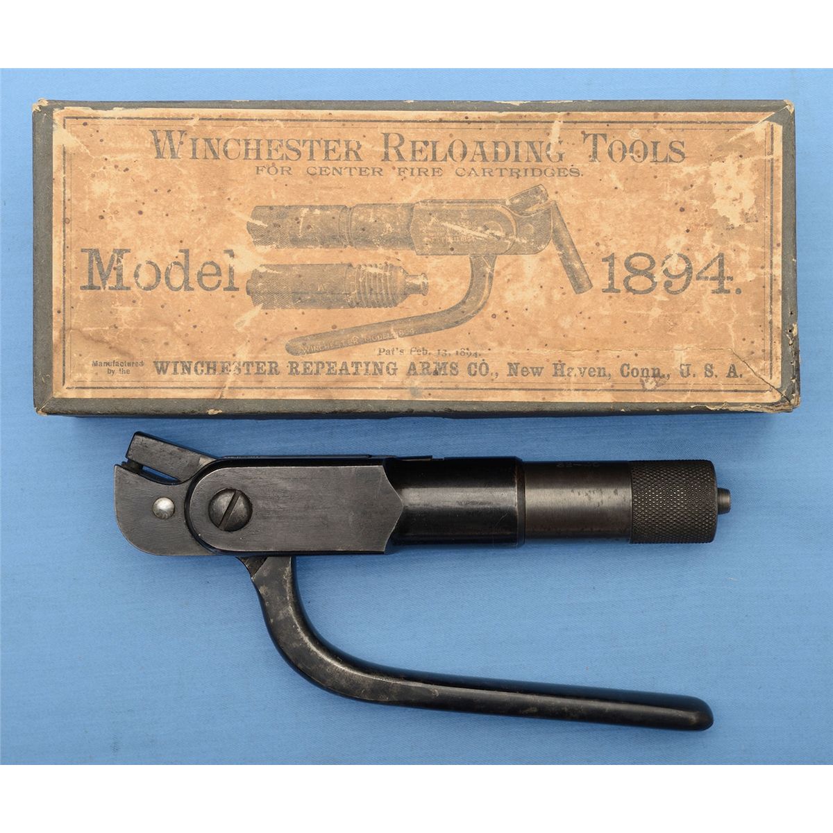 Winchester Model 1894 .32-40 reloading tool with original box, instruction/price sheet, 1 piece of brass, a powder dipper, and depriming punch. CONDITION: Very good, box is good.