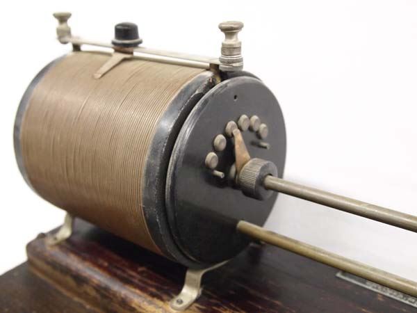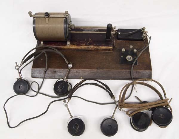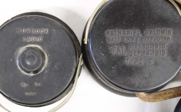 Antique Wm. J. Murdock Chelsea, Mass. Edison Radio Receiver, measures 18'' x 19'', wood base, comes with metal I.D. tag, Gallena Crystal, Catswhiskers missing, requires no electricity, comes with 3 headsets, 2 of the headsets read Murdock Radio No. 56, the other reads Nathaniel Baldwin Salt Lake City, Utah, May 10, 1910, Pat. Sep. 14, 1915 Type C