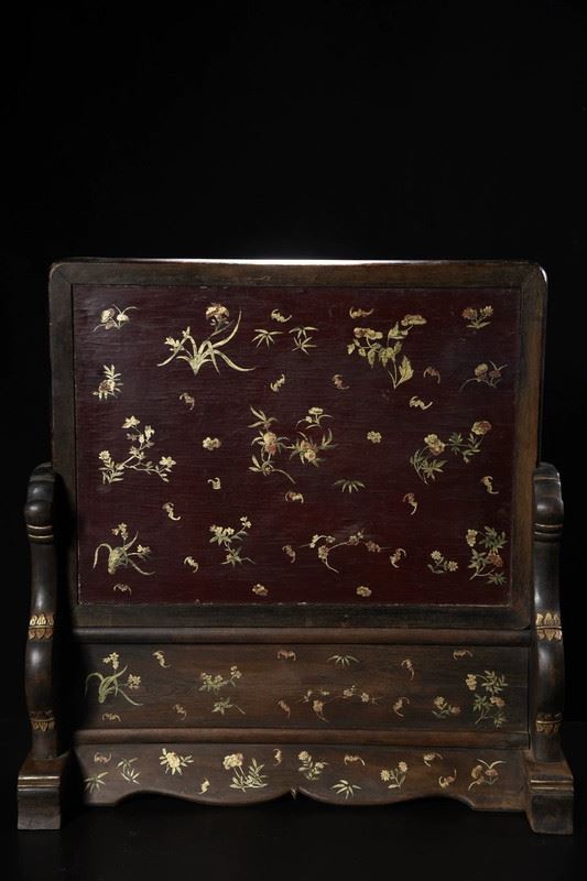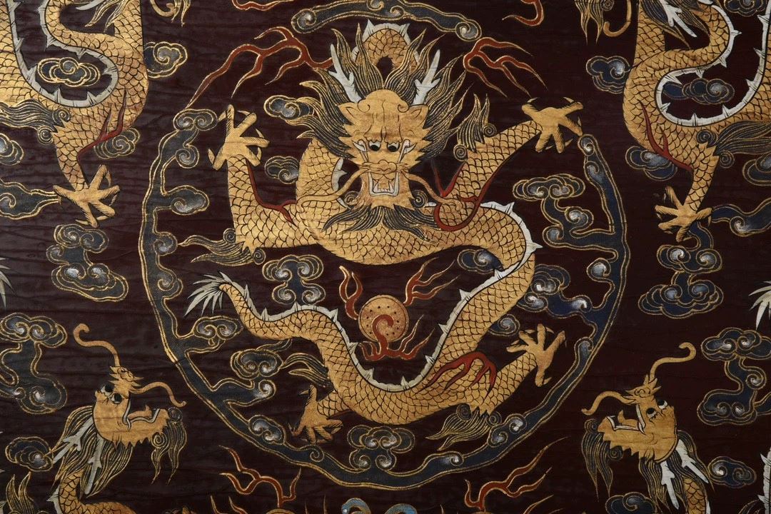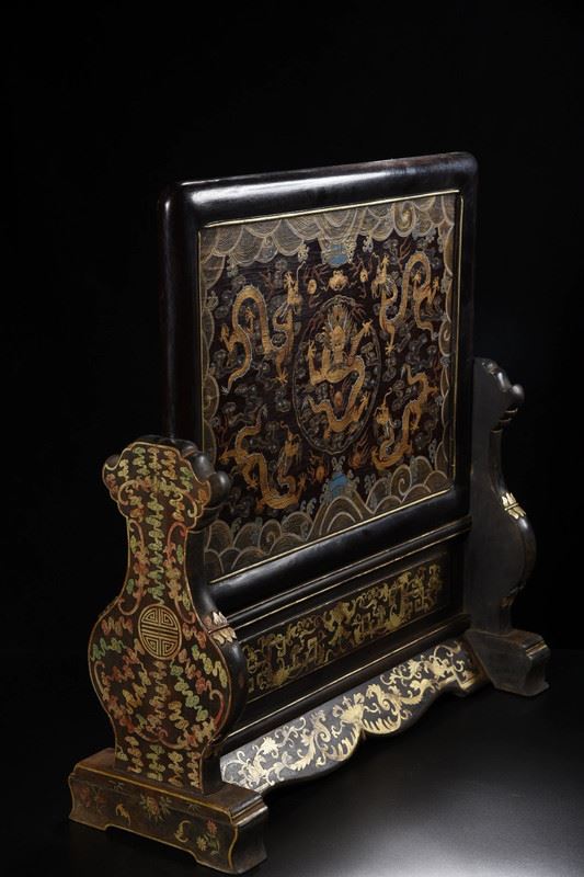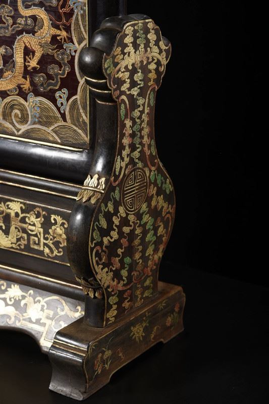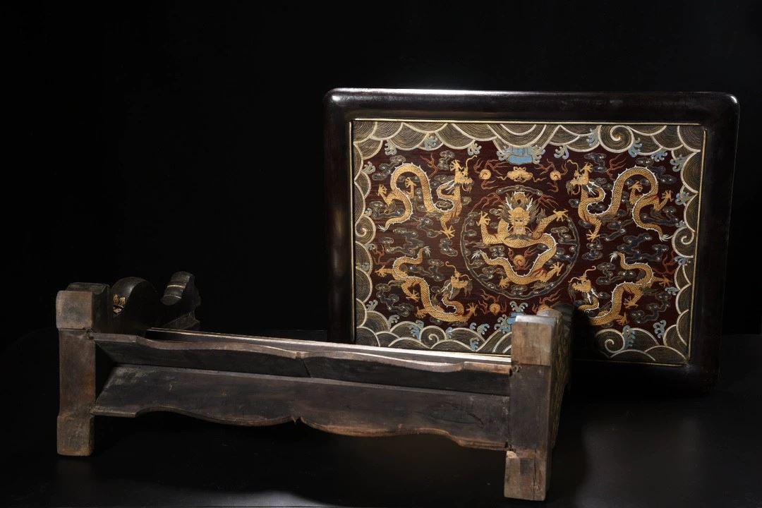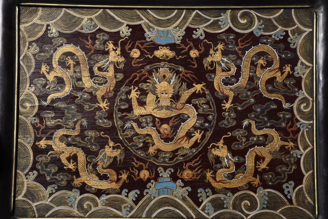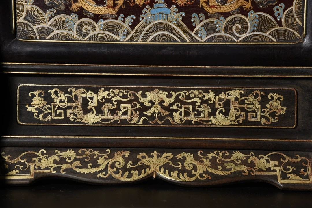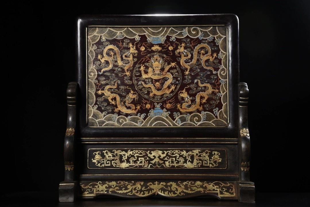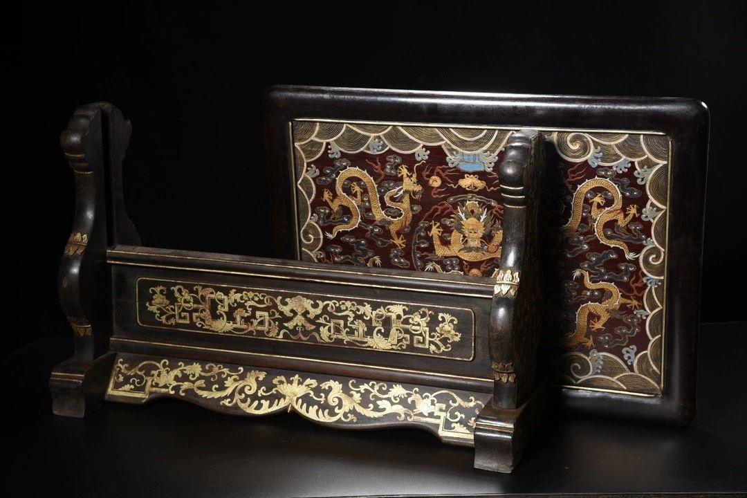 This antique wood-based lacquered "Dragon Playing with Pearl" screen showcases exquisite lacquer craftsmanship and the symbolic power of the dragon motif. The screen's central design features a dragon playing with a pearl, symbolizing strength, wealth, and good fortune. The dragon is depicted in a dynamic and lifelike manner, with the pearl shining brightly. The true gold detailing gives the design depth and radiance, while the smooth lacquered background enhances the visual contrast. The edges and base of the screen are adorned with delicate gilded patterns, adding to the overall elegance and refinement of the piece. This screen is a rare and valuable collectible, embodying traditional cultural and artistic beauty.