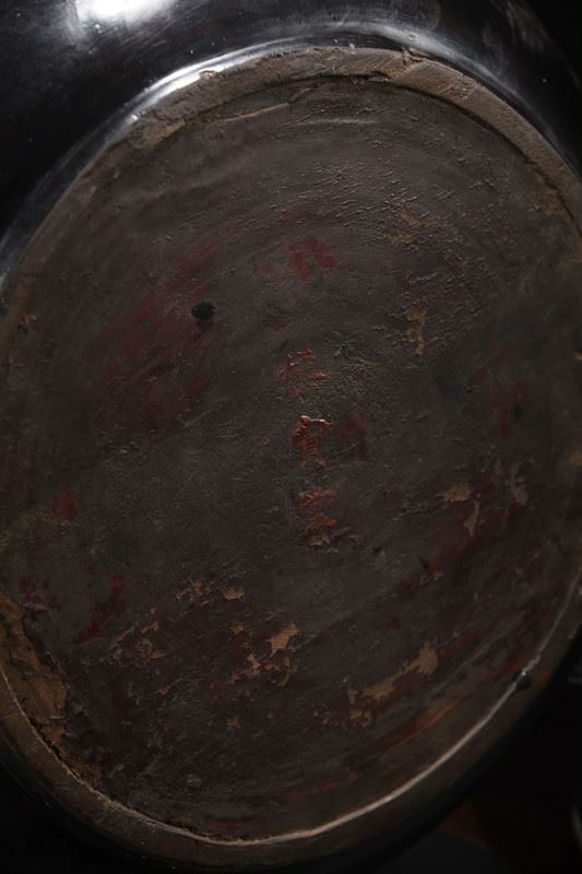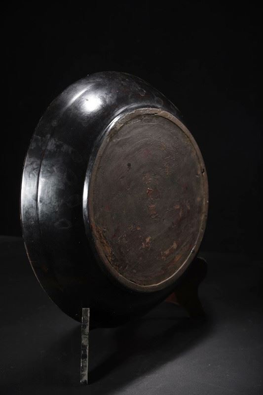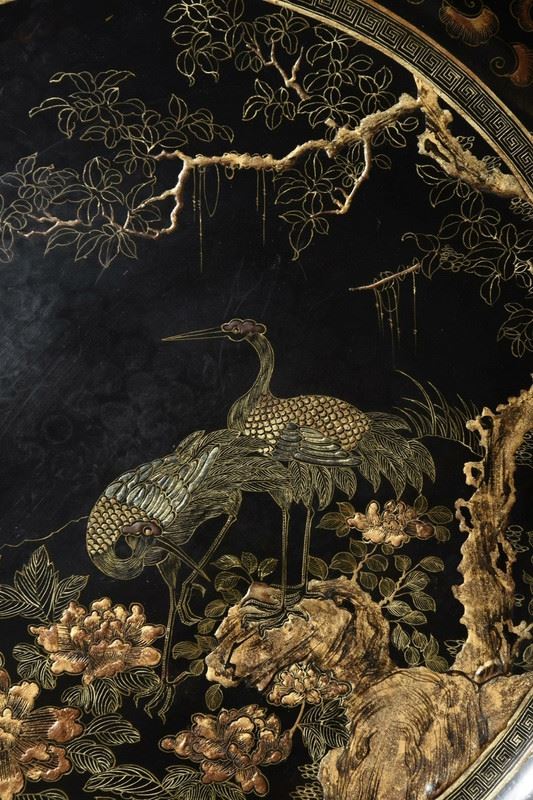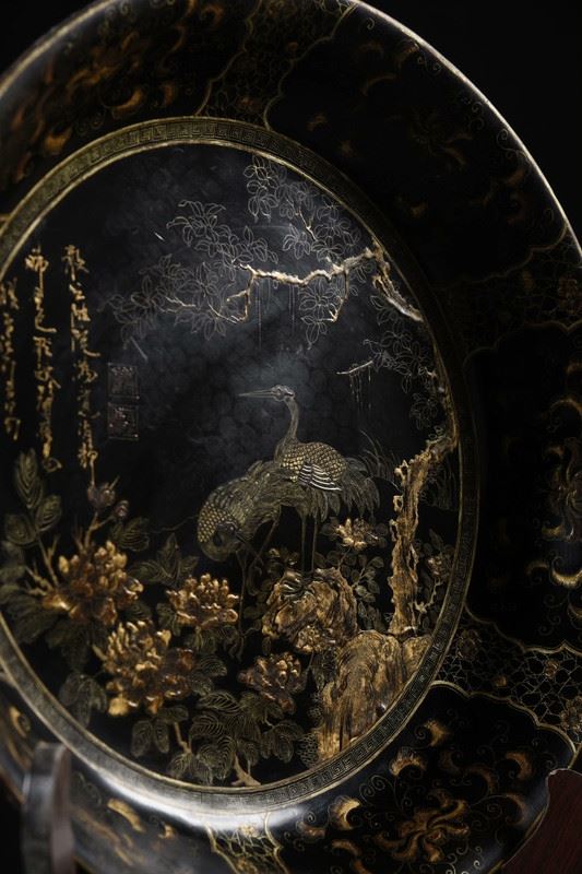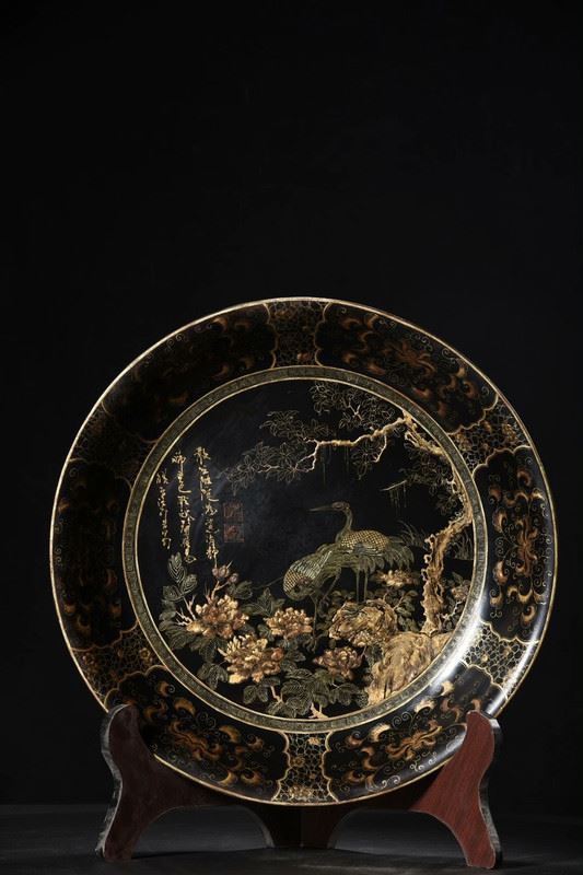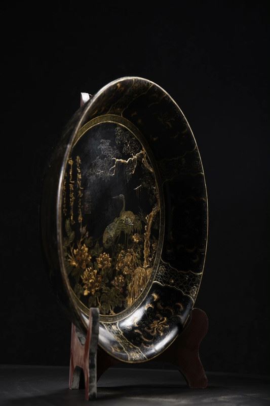 This antique wood-based lacquered "Pine and Crane Longevity" decorative plate showcases exquisite lacquer craftsmanship and profound cultural symbolism. The central design depicts a pine tree with a crane perched on its branches, symbolizing longevity and good fortune. The intricate and vivid patterns are enhanced by the true gold detailing, giving the image depth and a lustrous finish. The gilded floral motifs around the edge further accentuate the plate's elegance. This piece is not only a decorative masterpiece but also a valuable collectible with deep cultural significance.