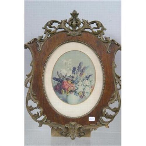 Antique Wood Frame with Floral Print.This is a magnificent wood frame in the style of a shield or plaque with an elegant gilt carving and beaded border around the print. The floral print is under an oval mat, and the backing is age toned paper. This is a marvelous compliment to any wall and dates - 1880-1920.