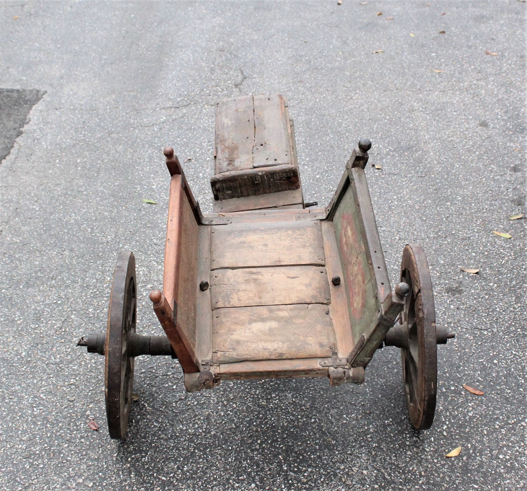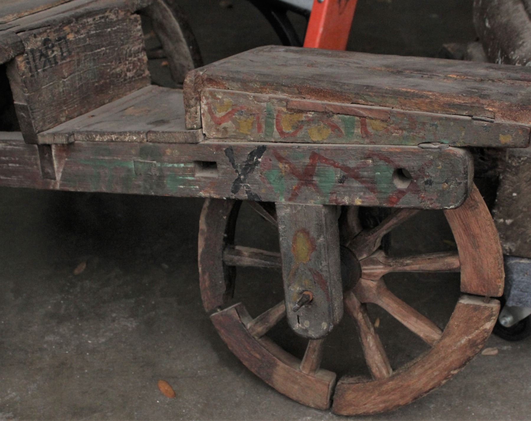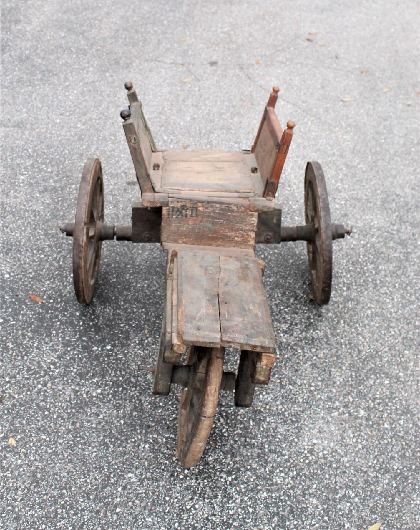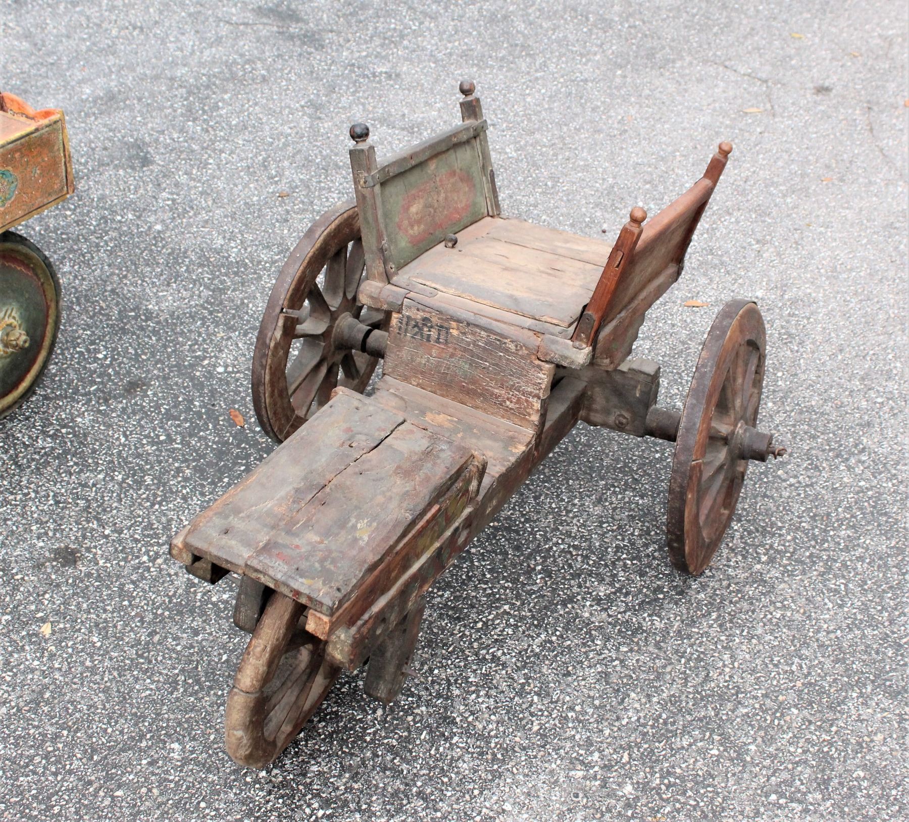 Antique rustic wood piece, either a three wheel wheelbarrow or a three wheel wagon. Commensurate with age.
