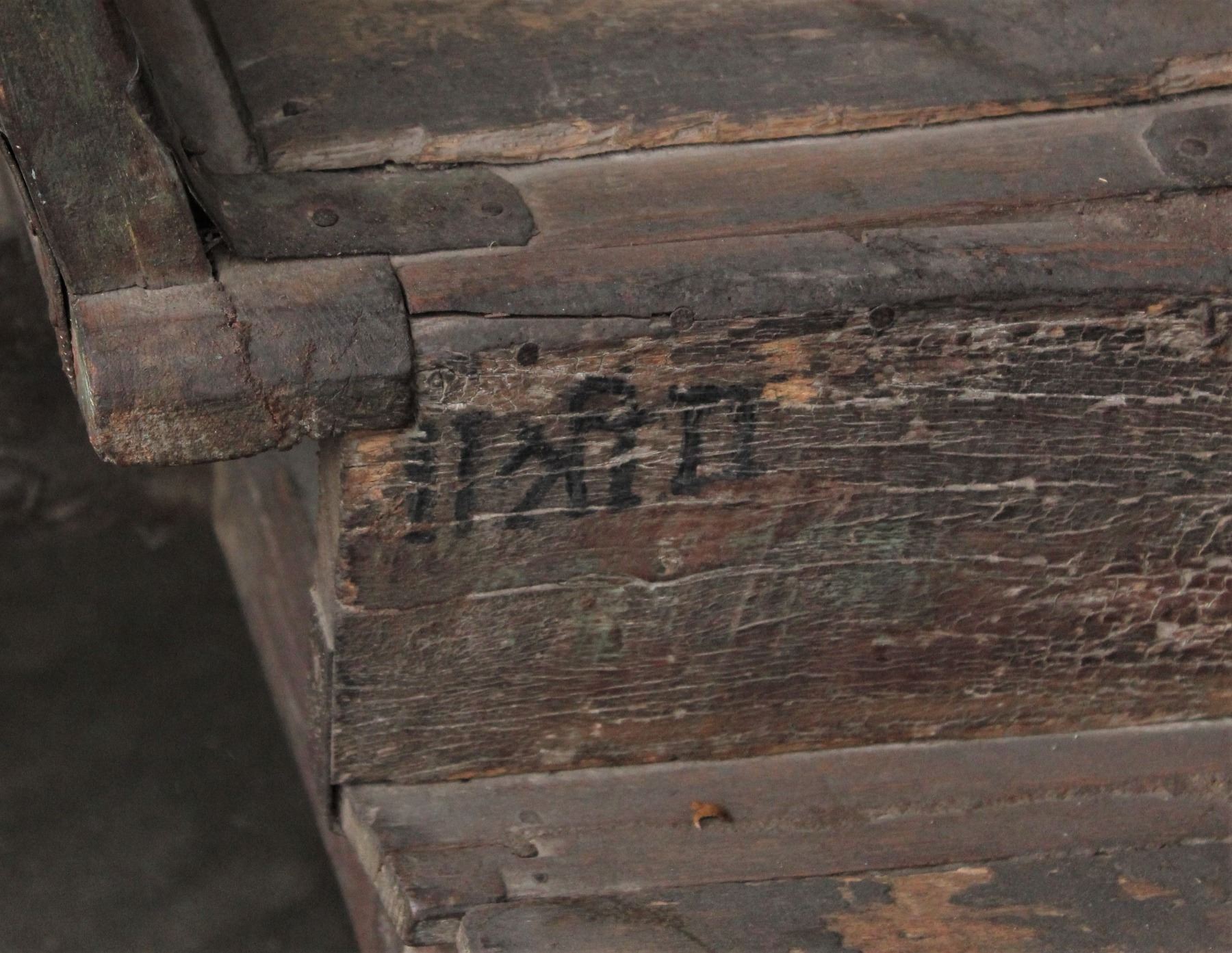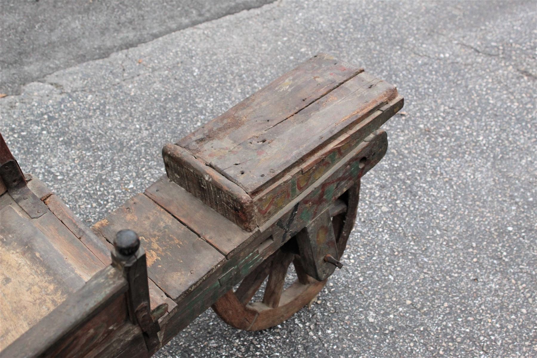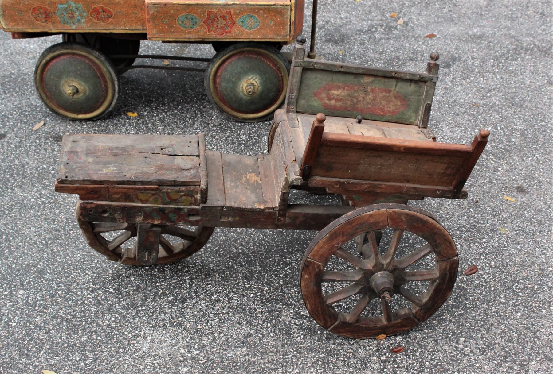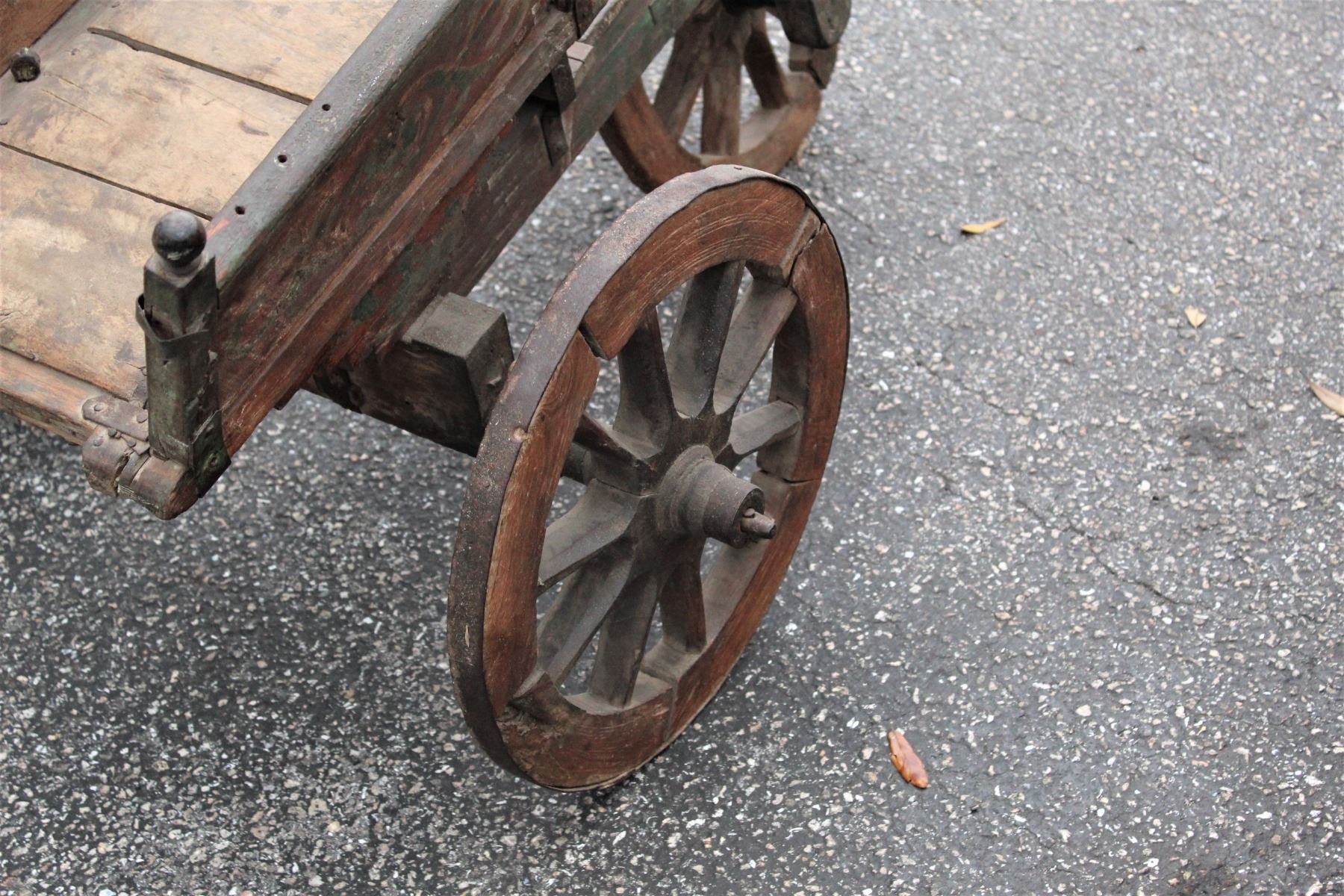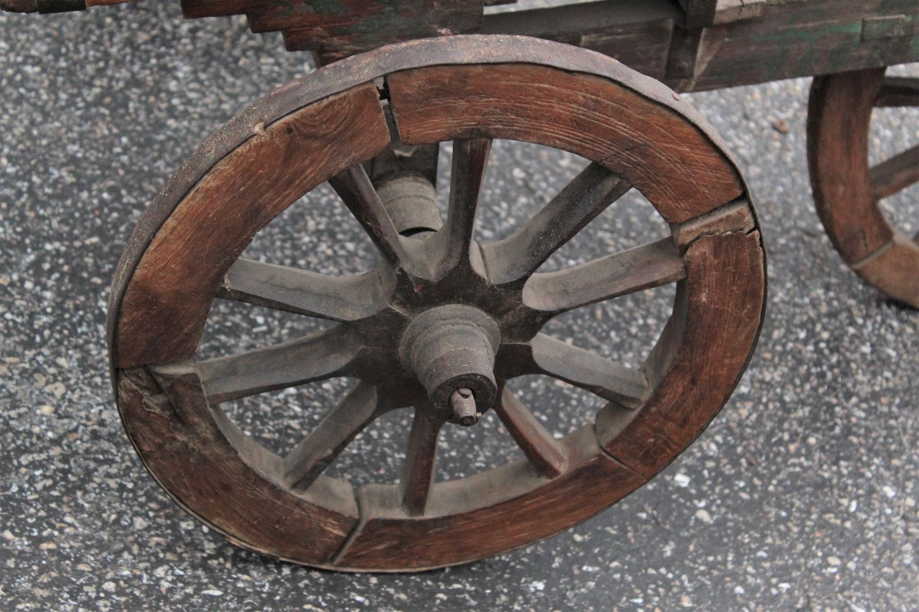 Antique rustic wood piece, either a three wheel wheelbarrow or a three wheel wagon. Commensurate with age.