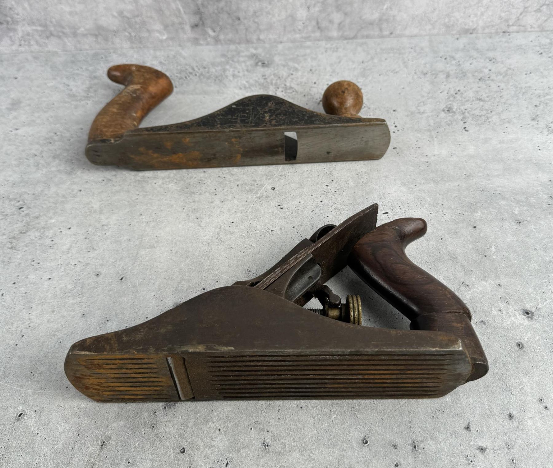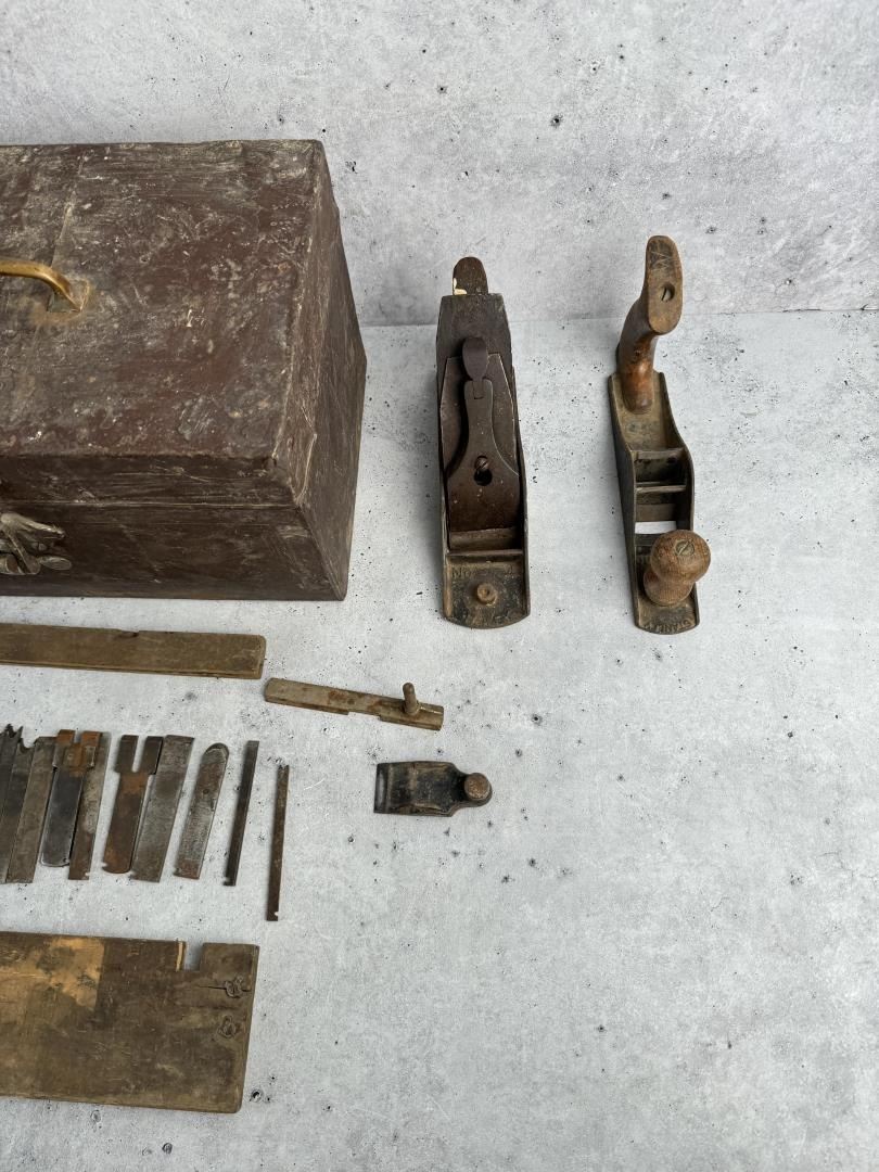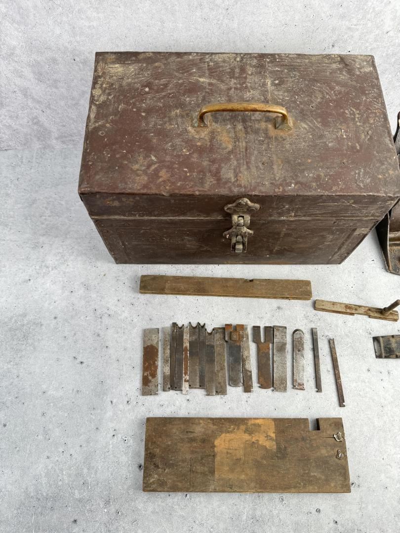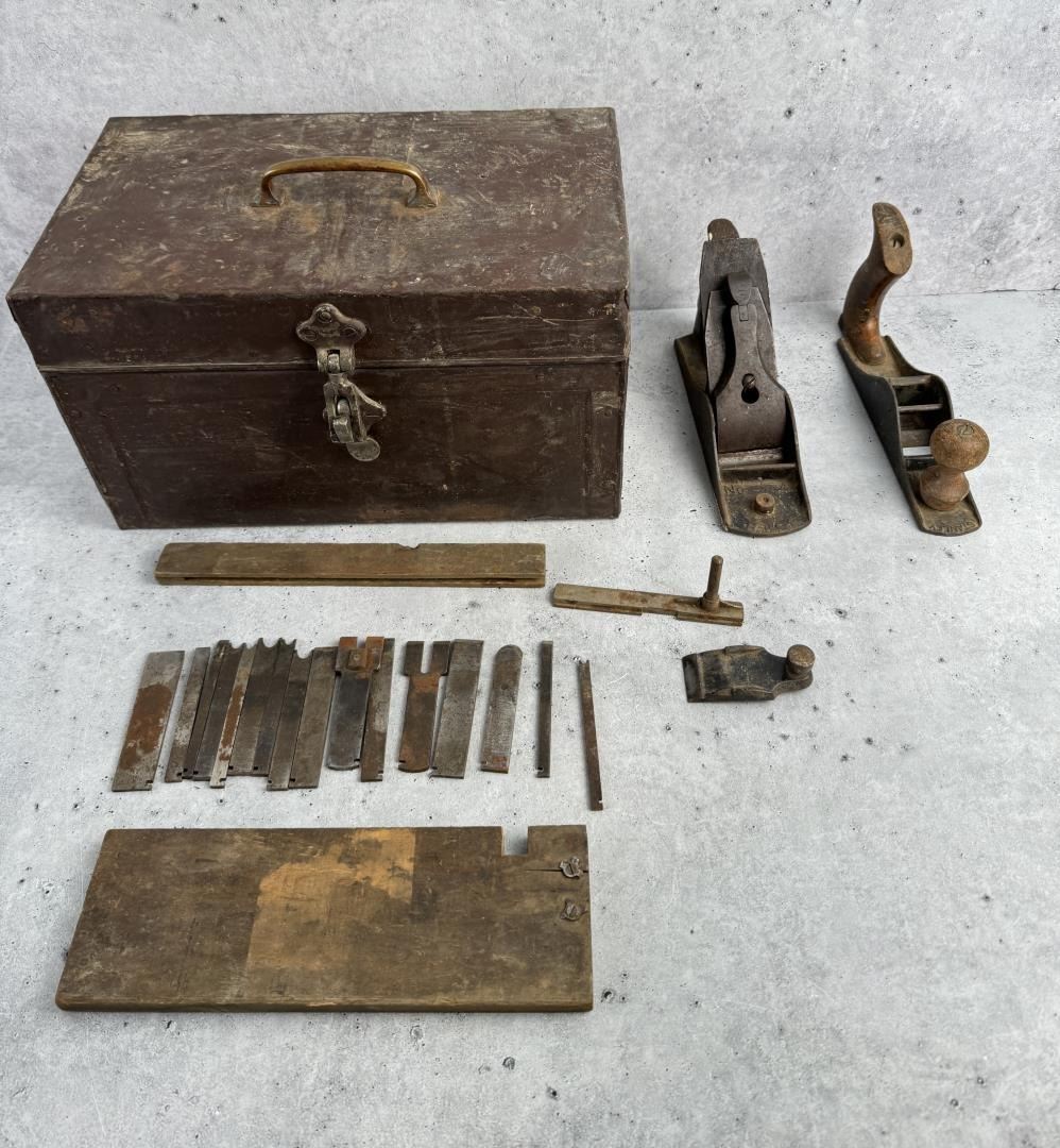 Includes two incomplete planes and a collection of cutters. 14 1/4" by 9 1/2" by 9".