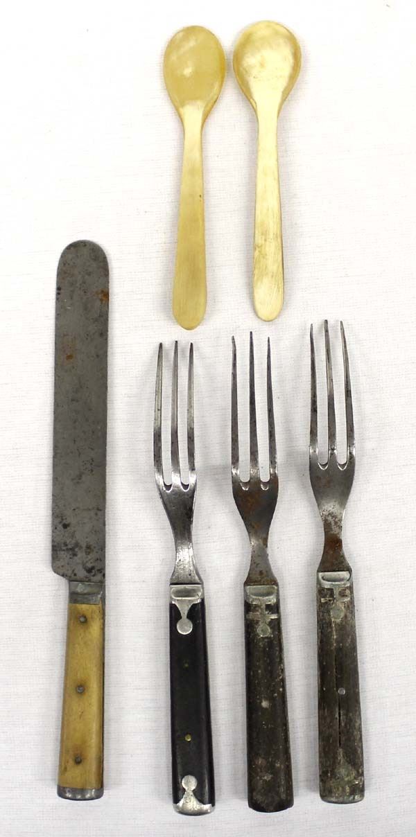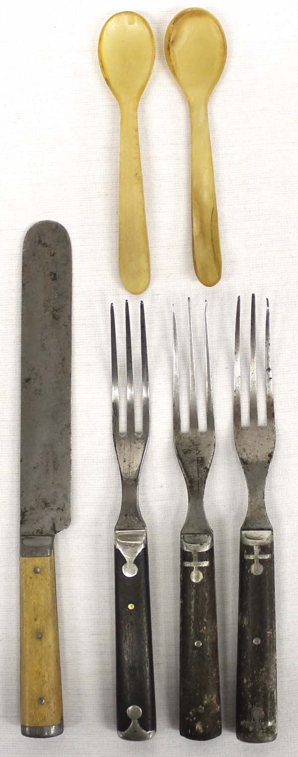Antique Wood and Bone Utensils, longest measures 1'' x 8.75'', includes 3 Primitive American Civil War Era Wood Forks, One 1860s Civil War Era Bone Handled Knife, and Two Small Carved Bone Spoons