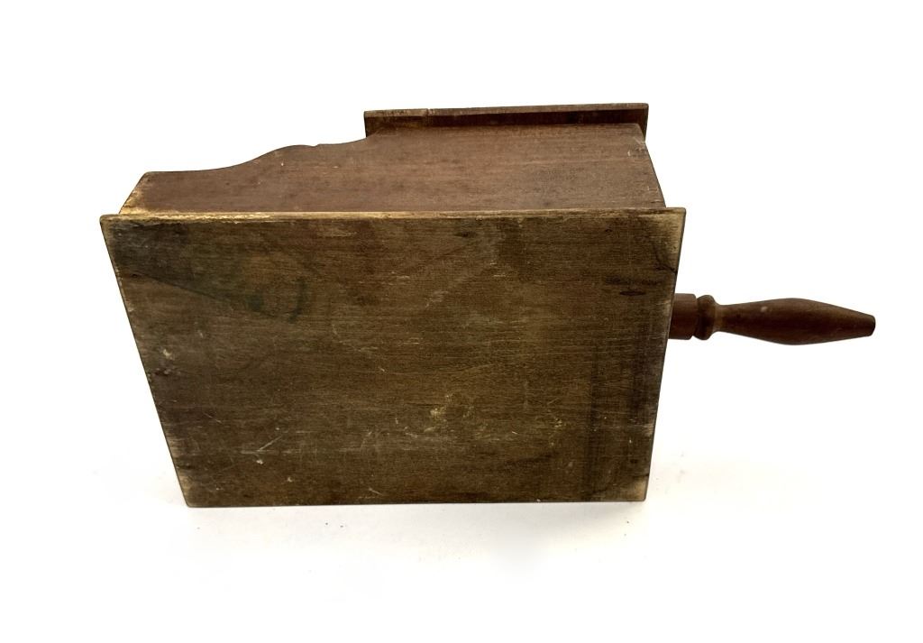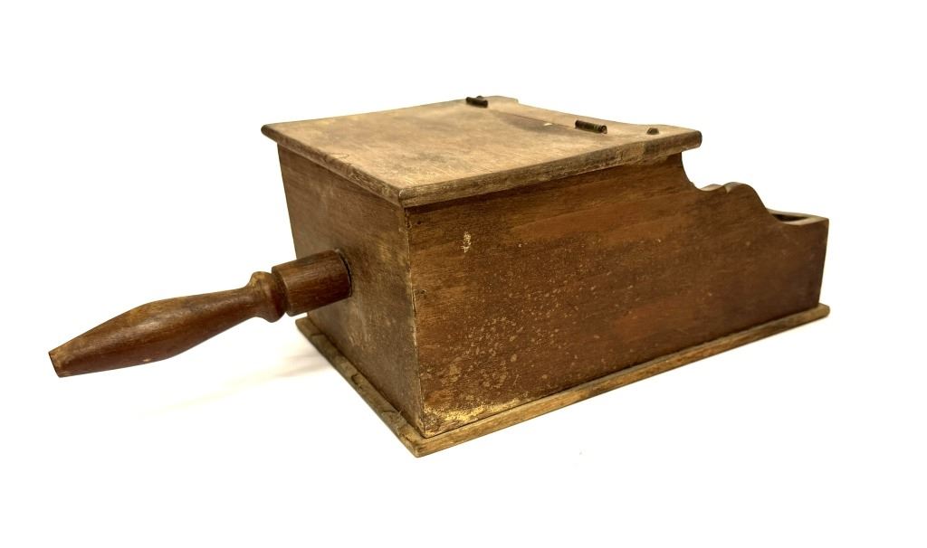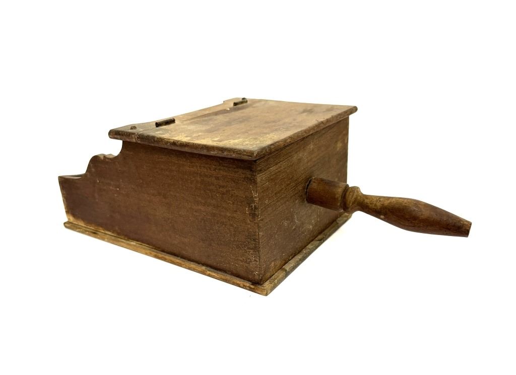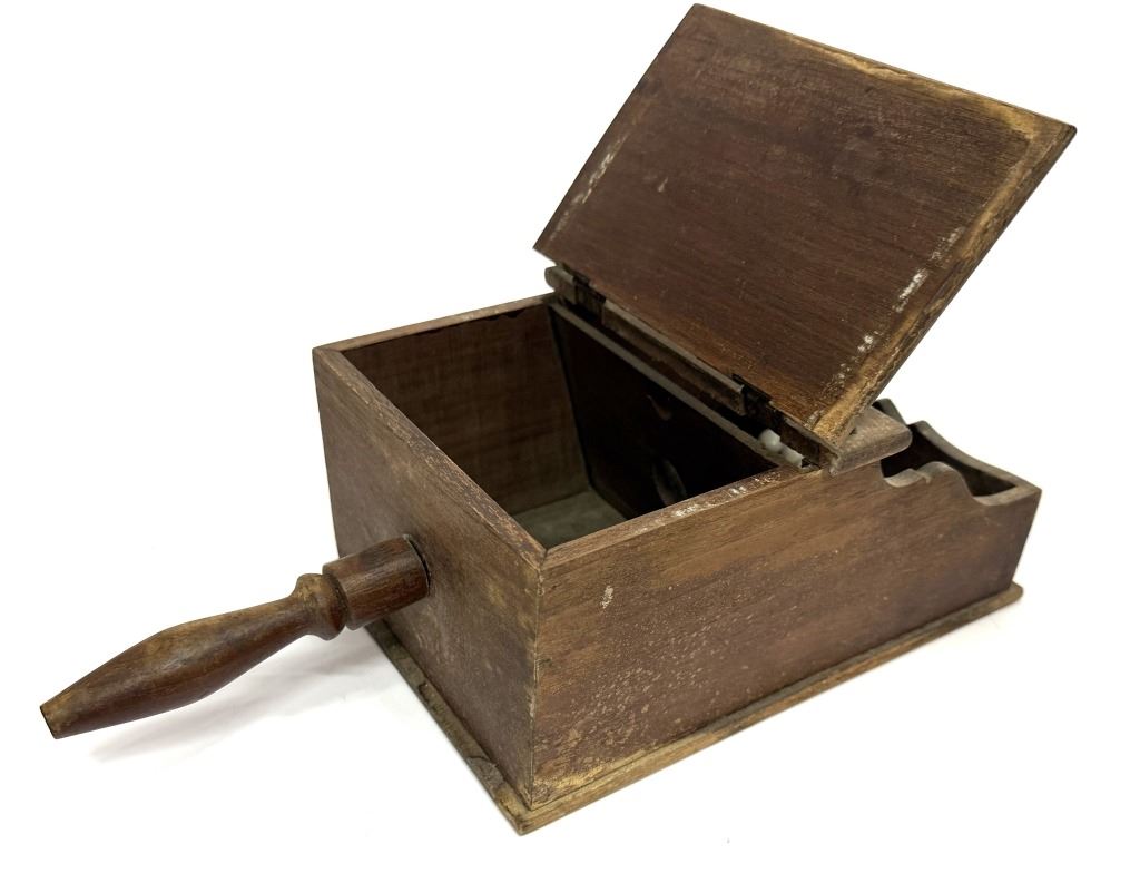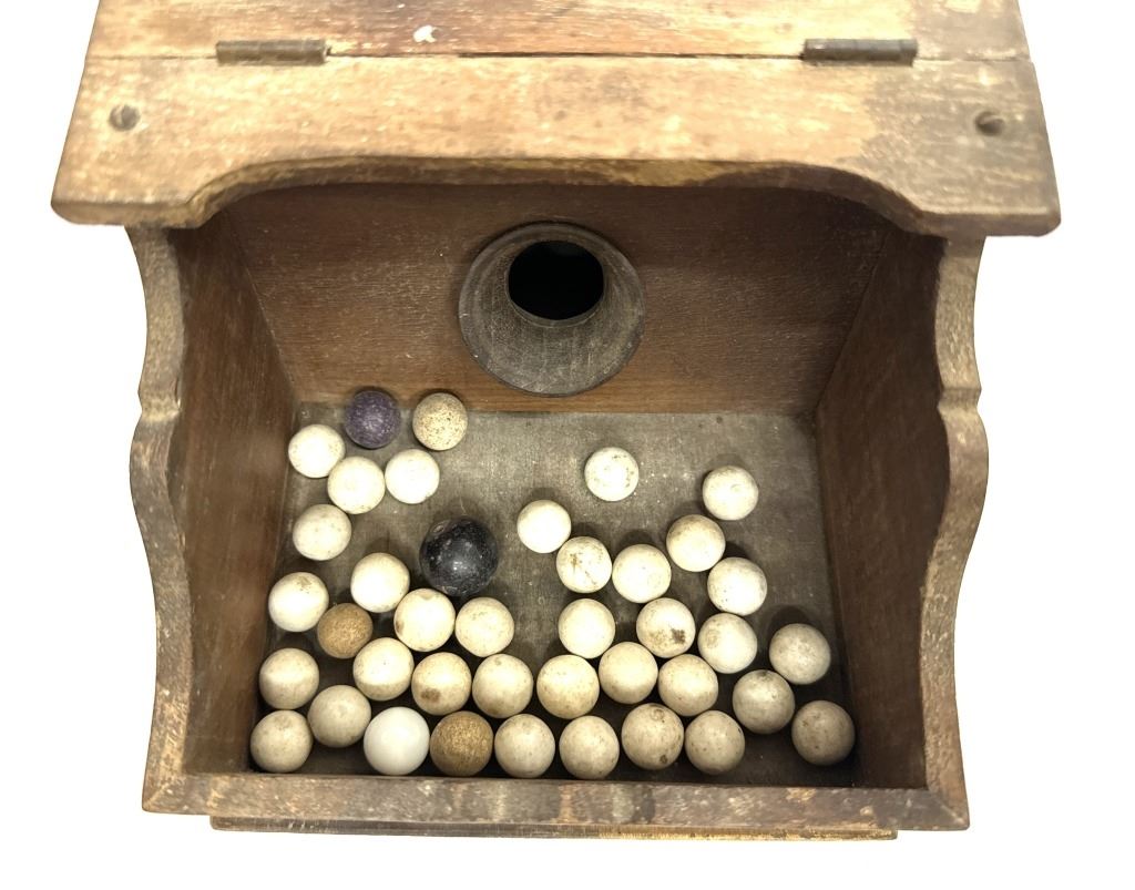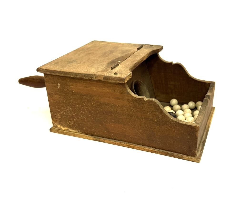 Item/Description: Antique wooden black ball ballot box, historically used by fraternal organizations and clubs for voting on new members. Voters would discreetly place either a white ball (indicating approval) or a black ball (indicating rejection) into the box. The term "blackballing" originates from this practice, where even a single black ball could lead to a candidate's rejection and allowed for anonymous objections. The box is designed with features that ensure the confidentiality of each individual vote. Contains 39 marbles.