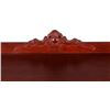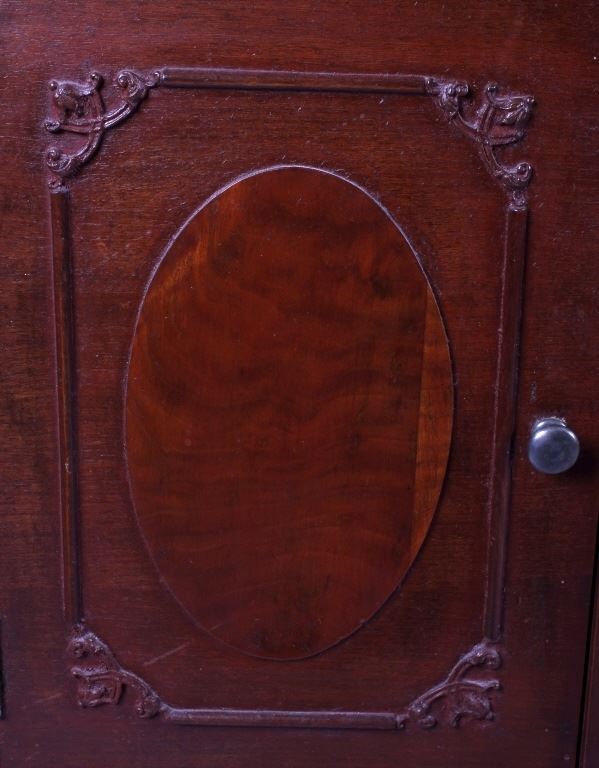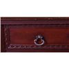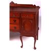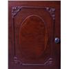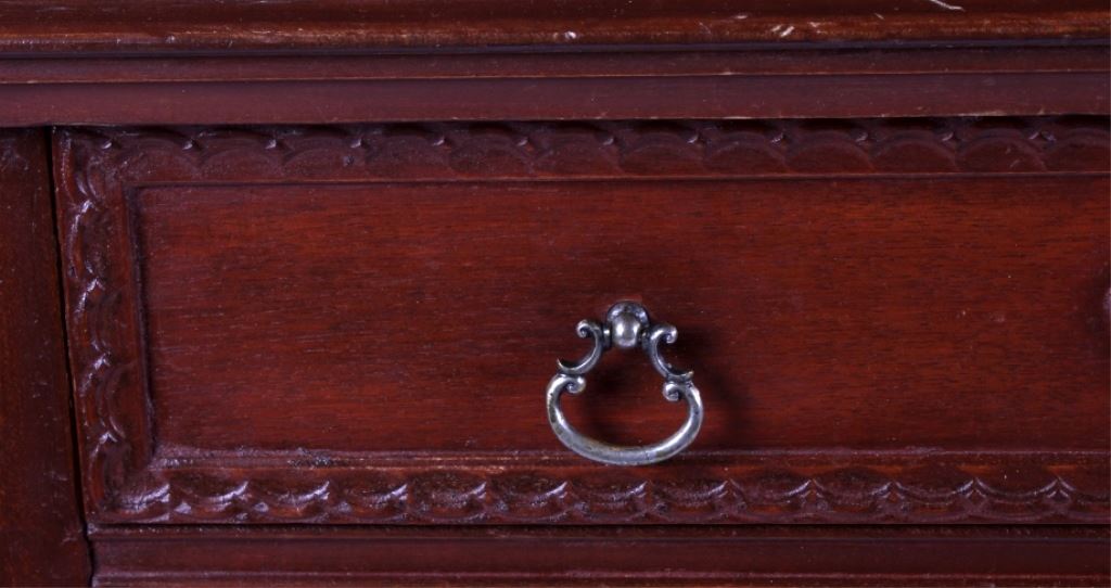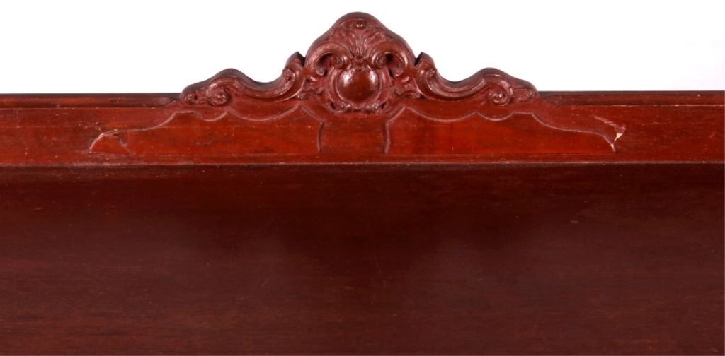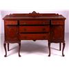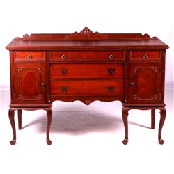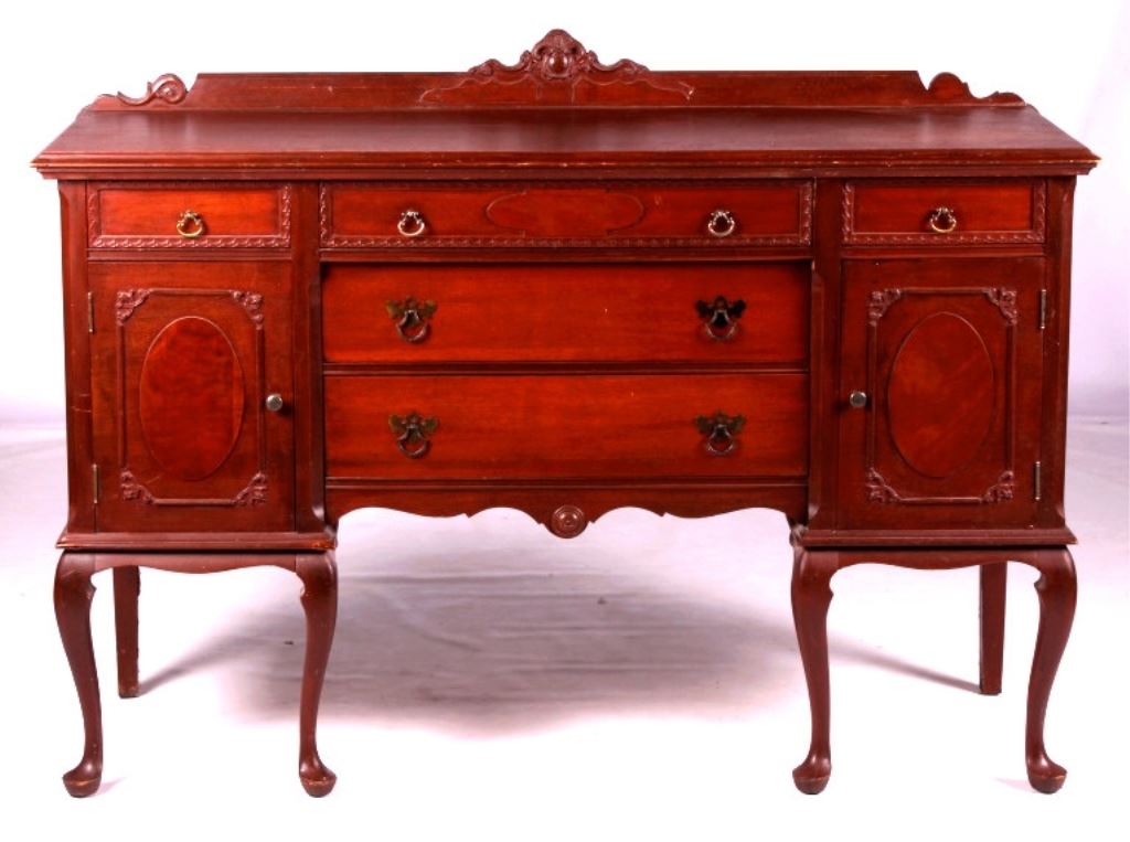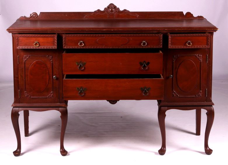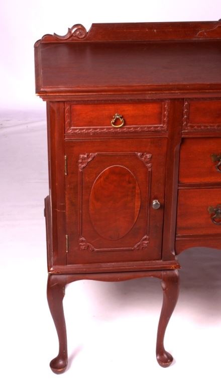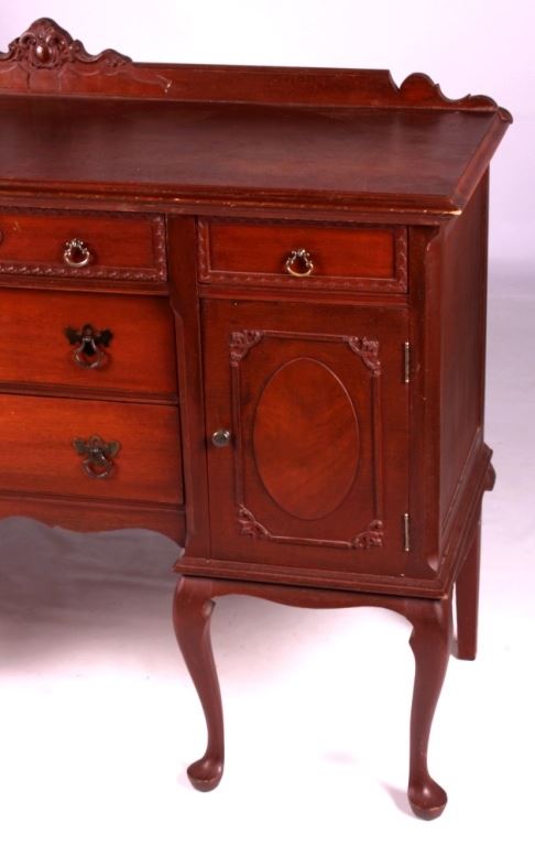 This is an antique wooden buffet. The buffet features five drawers and two doors that open for abundant storage space. The buffet has a beautifully carved backsplash and carved accents throughout the piece. The antique buffet is in good condition. It measures 21" x 60" and is 43" tall.