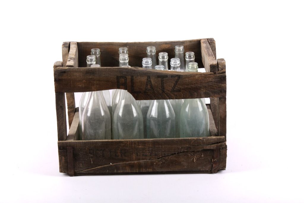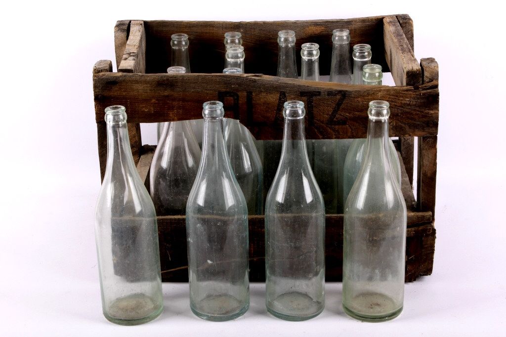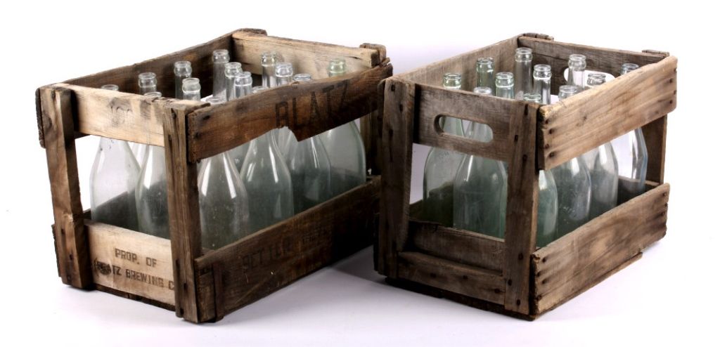 This lot includes two wooden cases with 25 bottles. This collection is believed to be from the Virginia City, Montana area. The cases are Blatz beer cases. The bottles are in good condition, some show case wear andminor chips. The cases measure 11" x 16" and are 12" tall. The bottles measure 11.5" tall.