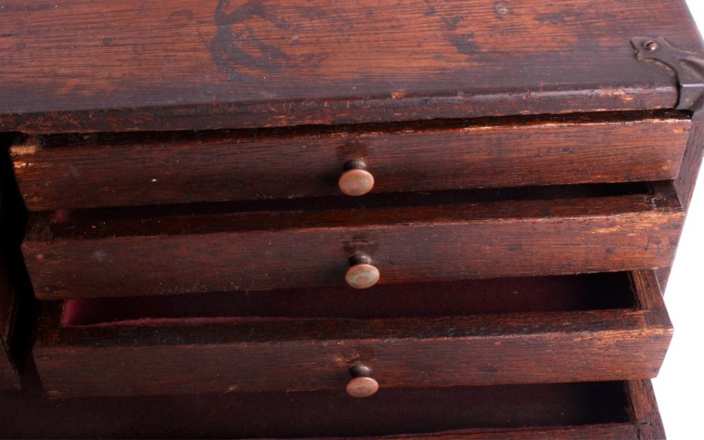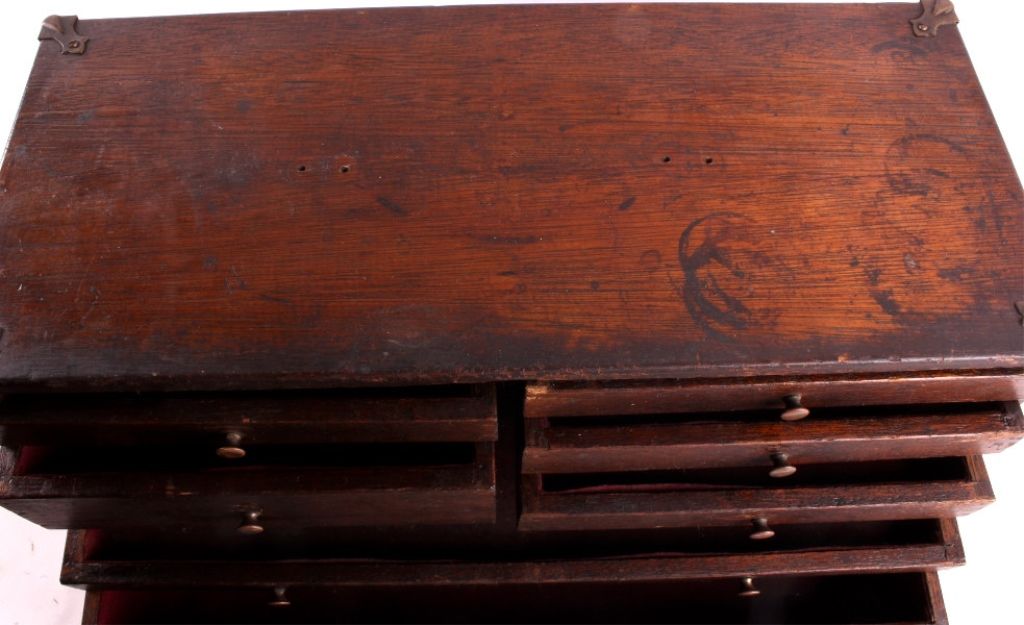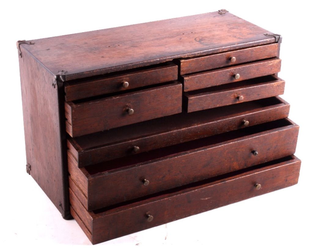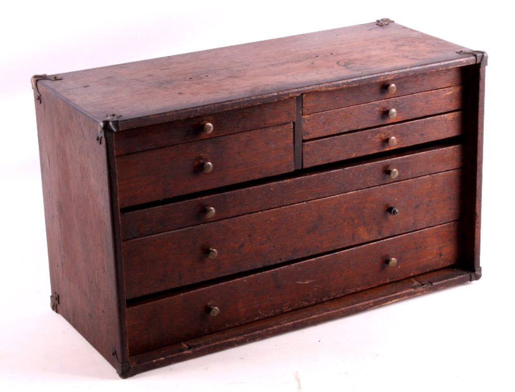 This is an antique wooden machinist tool chest. The tool chest does not have the front. There are 8 drawers of varying size. Each drawer is lined with felt. The antique machinist tool cabinet is in good condition. It measures 9" x 20.5" and is 12.5" tall.