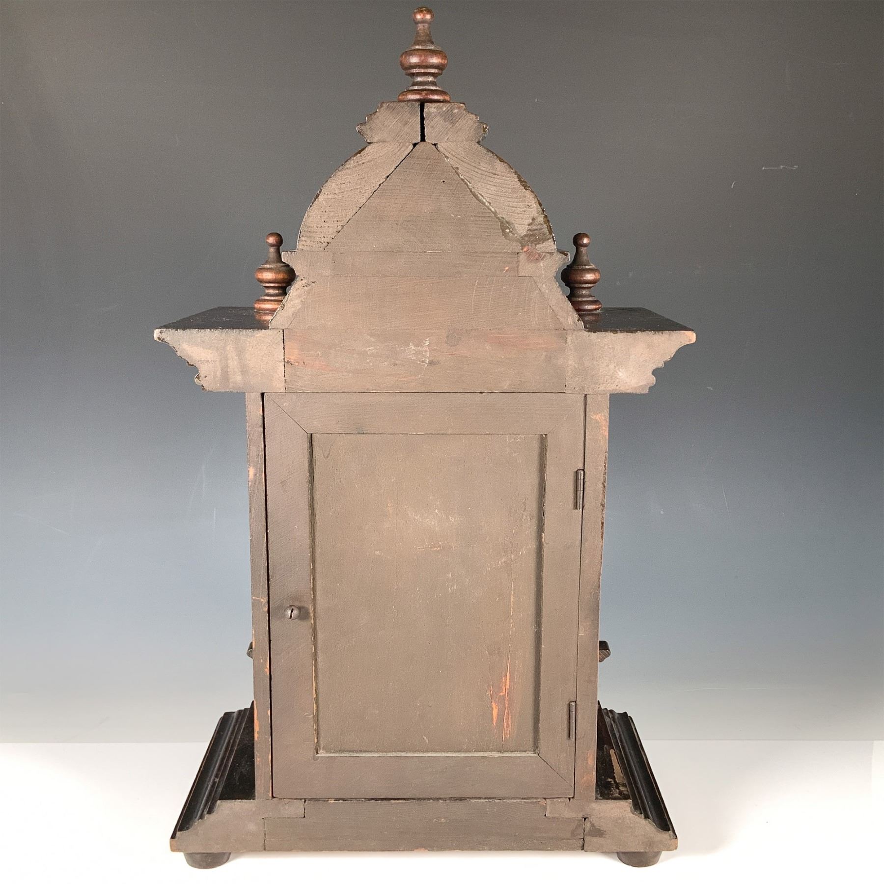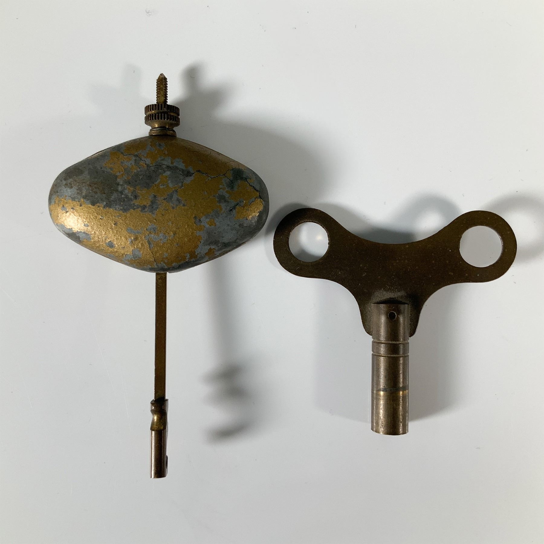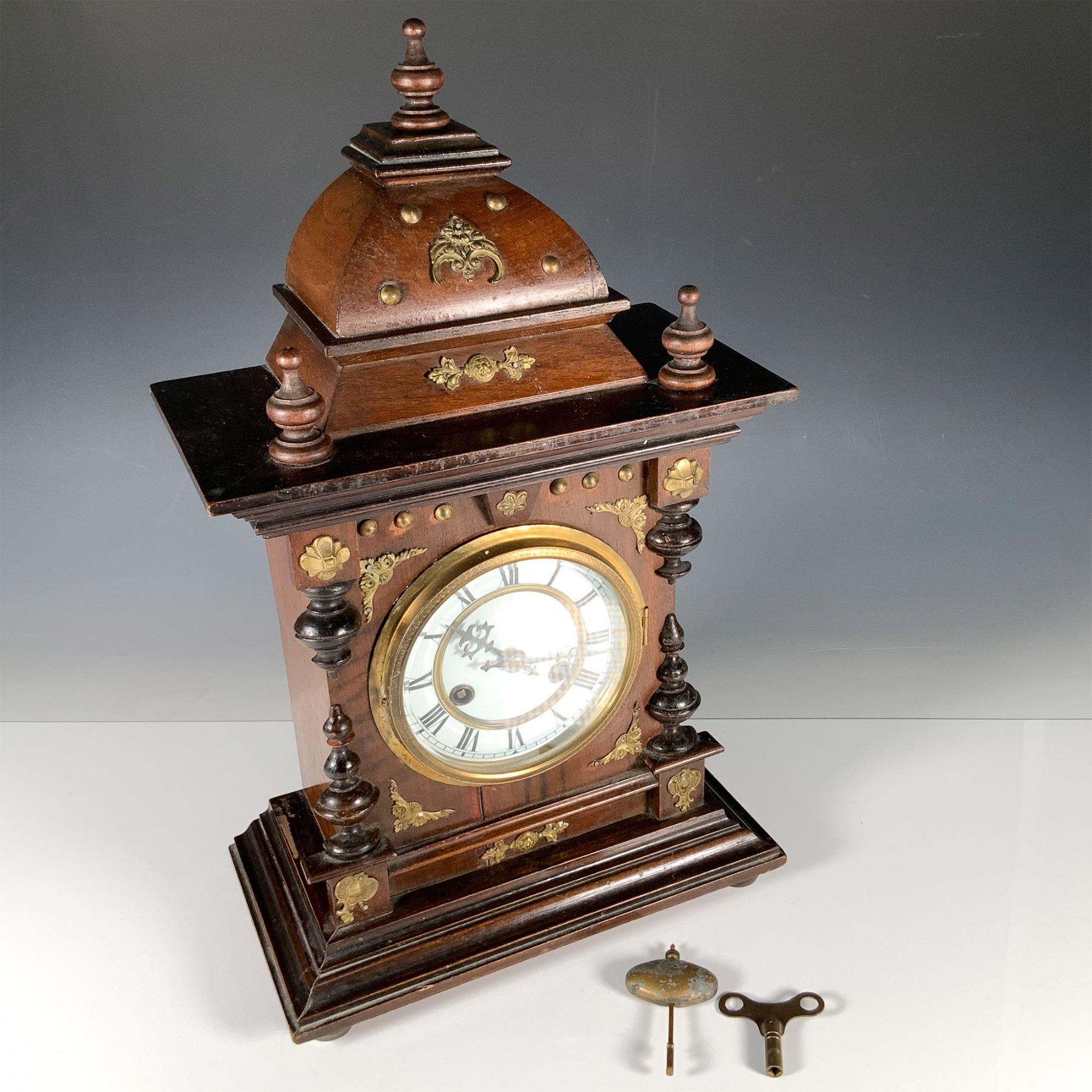 Elegant antique wooden mantel clock featuring a rich wooden case with decorative brass embellishments, turned finials, and a domed top. The clock face showcases Roman numerals and an ornate dial within a brass bezel. Accompanied by a brass winding key and an adjustable pendulum. The back panel has a hinged door for access to the clocks movement. Some signs of age-related wear consistent with its vintage nature.