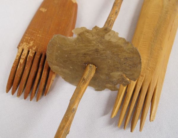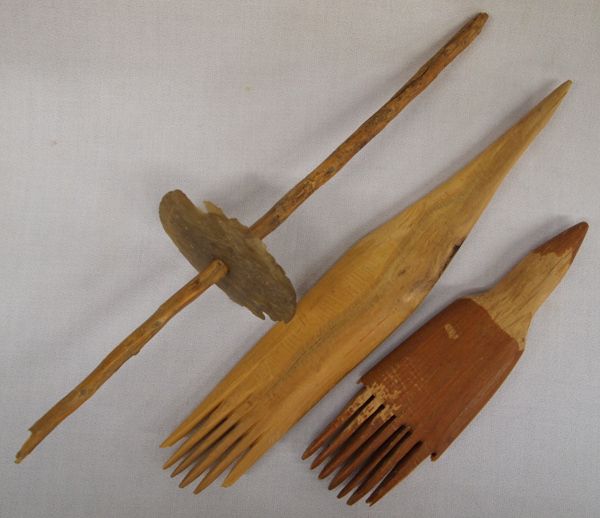 Antique Wooden Navajo Weaving Tools, including Drop Spindle 12'' L & Wheel 3''W, wheel is made of horn, and 2 Combs (combs are missing some teeth from age & use wear).