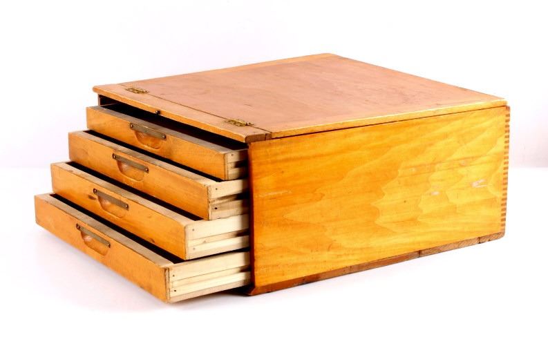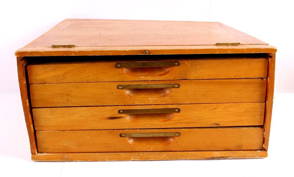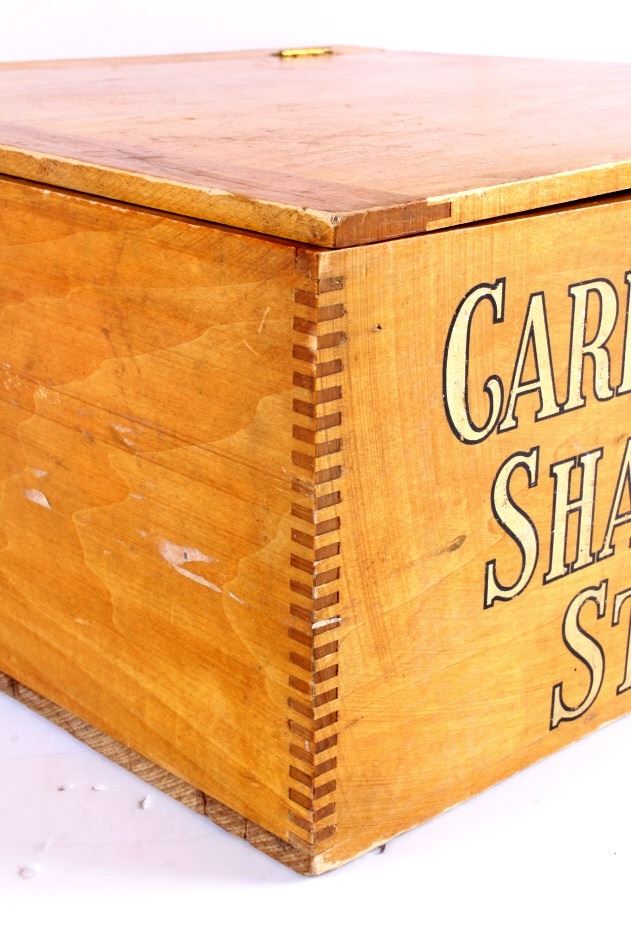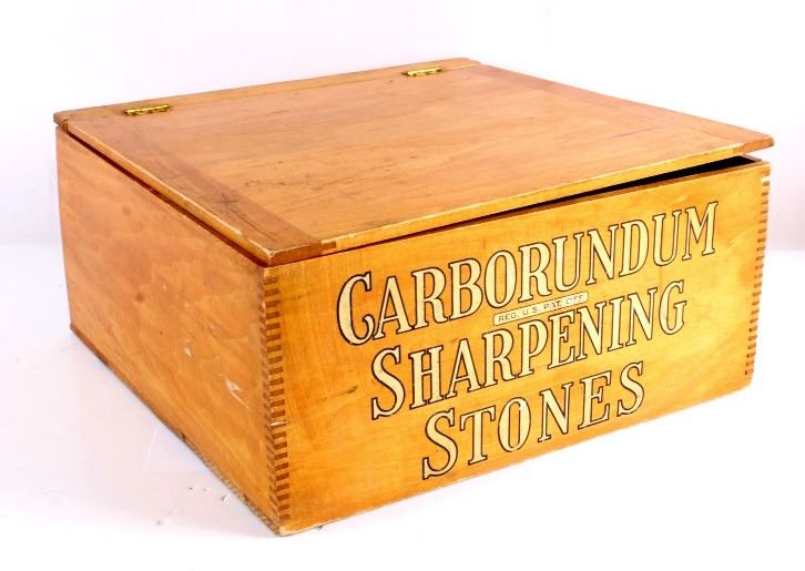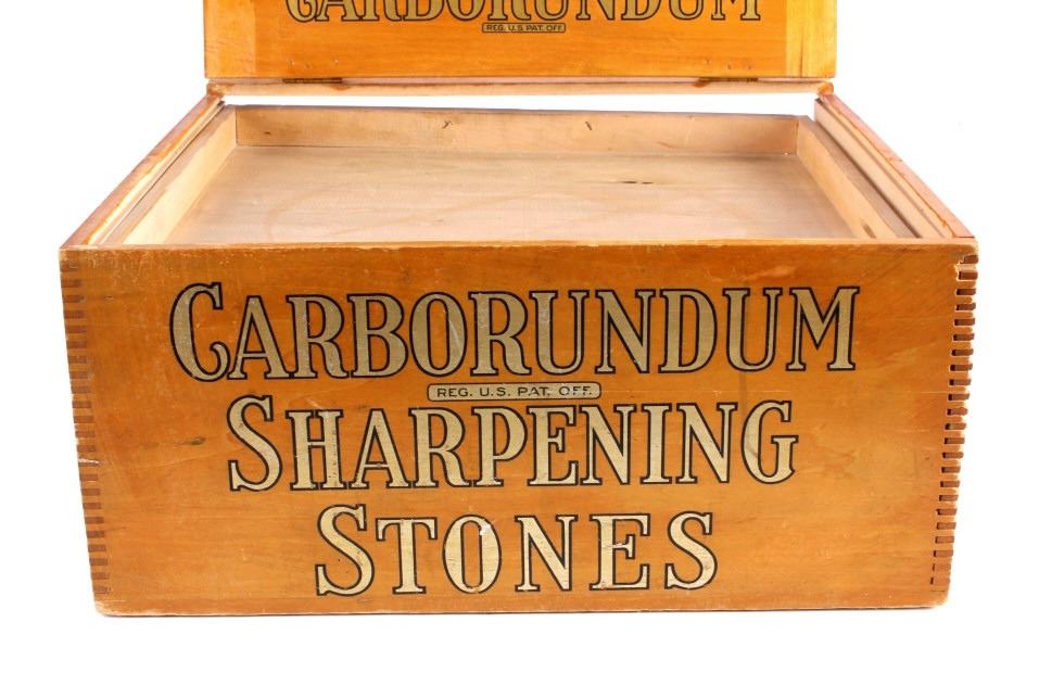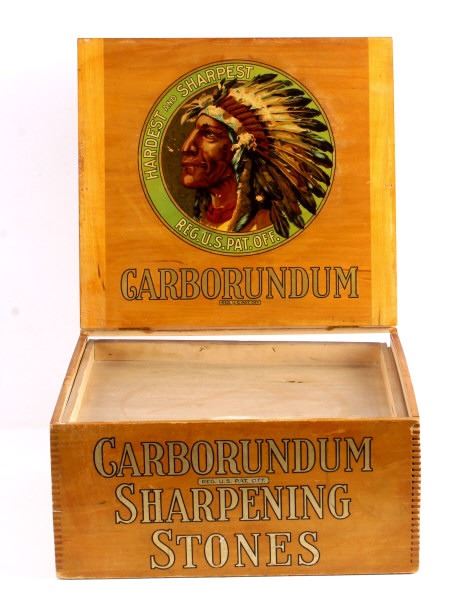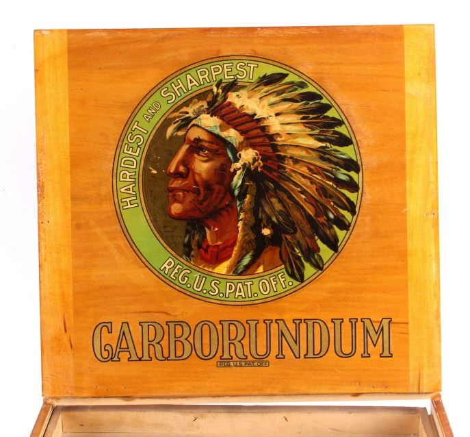 This is an original antique wooden store display box for Carborundum sharpening stones. The box shows a wonderful tongue and groove design with four drawers that open from the rear. The front of the piece reads "Carborundum Sharpening Stones". The inside of the lid has an original graphic label showing the Native American Indian in full headdress. Below the Indian image is another label that reads "Carborundum". This is a fantastic early hardware store piece. The wooden box is in good condition. It measures 14.5" x 14.5" and is 6.75" tall.